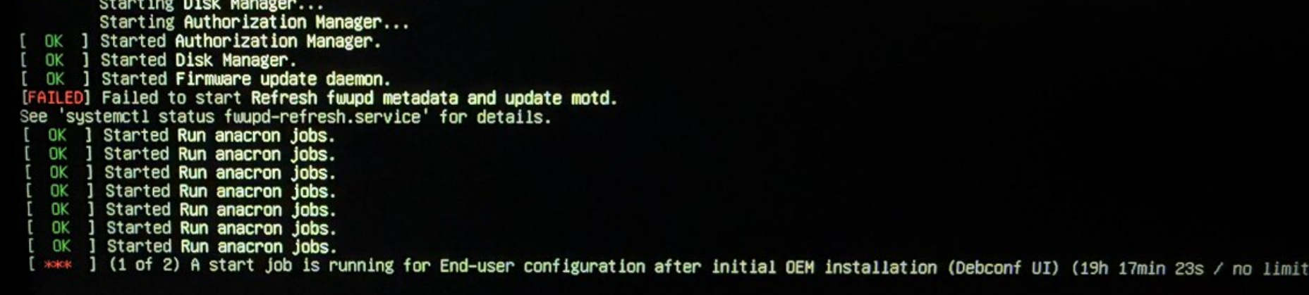 (1 of 2) A start job is running for End-user configuration after initial OEM installation (Debconf UI)