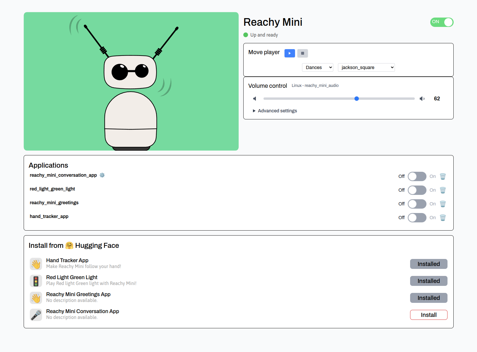 Reachy Mini features a growing ecosystem of ready-to-use applications powered by Hugging Face Spaces. Install these apps directly from your robot's dashboard with one click.