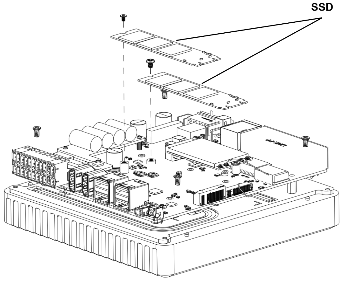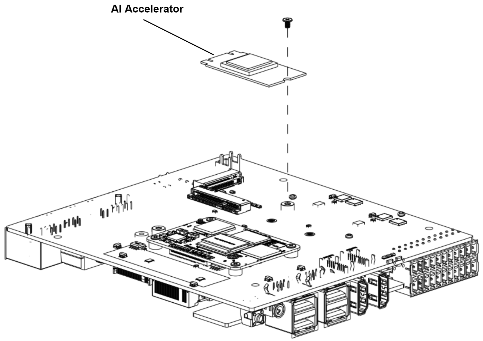 Step 1: Disassemble the entire device following section 4.1 "Disassembly Guide". Step 2: Load the AI Accelerator into the M.2 socket and lock the screws.