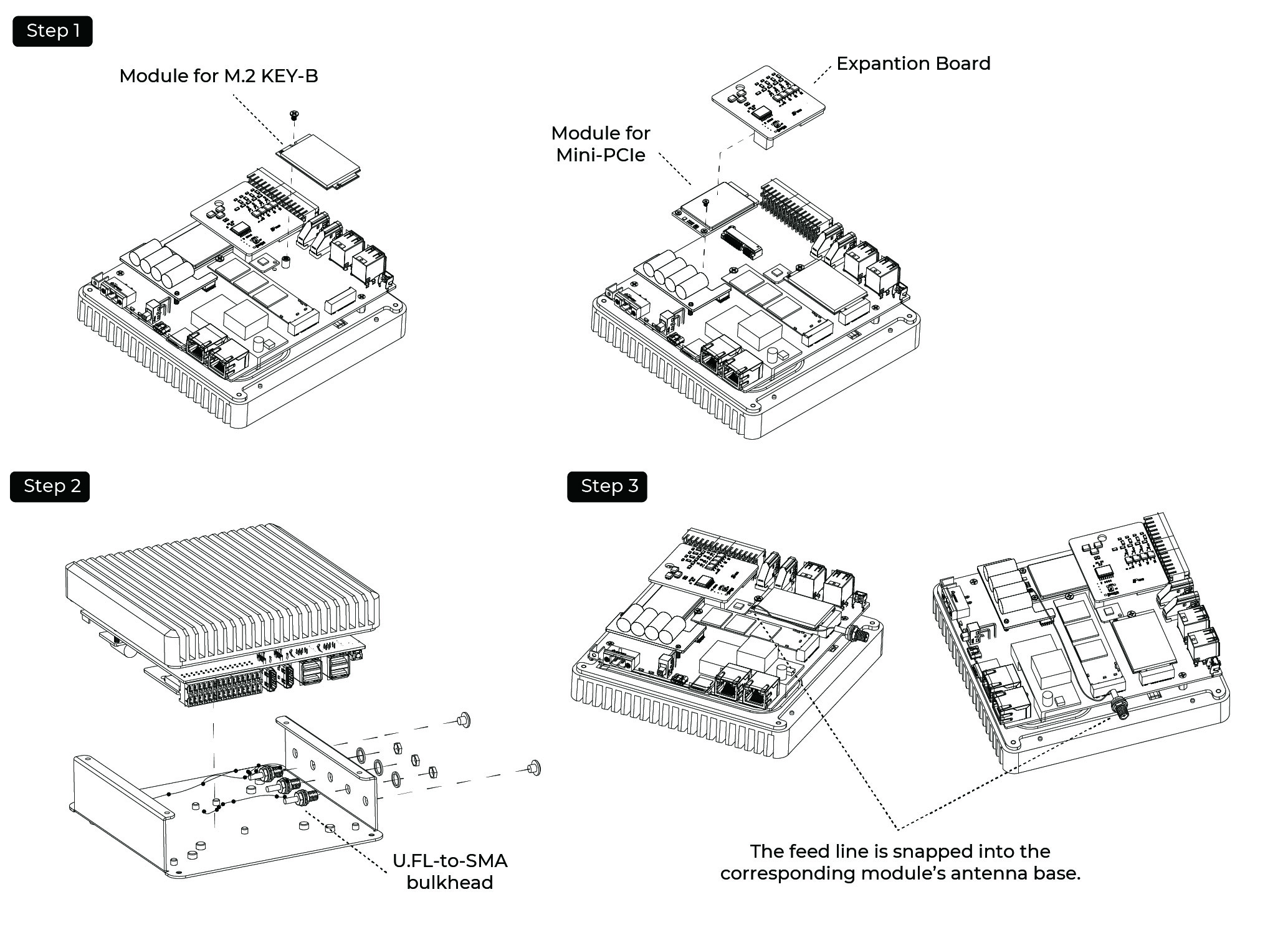 Step 1: Remove the Expantion Board and load the 4G module/LoRa® Module/Zigbee Module into the Mini-PCIe/M.2 B-KEY slot and lock the screws.