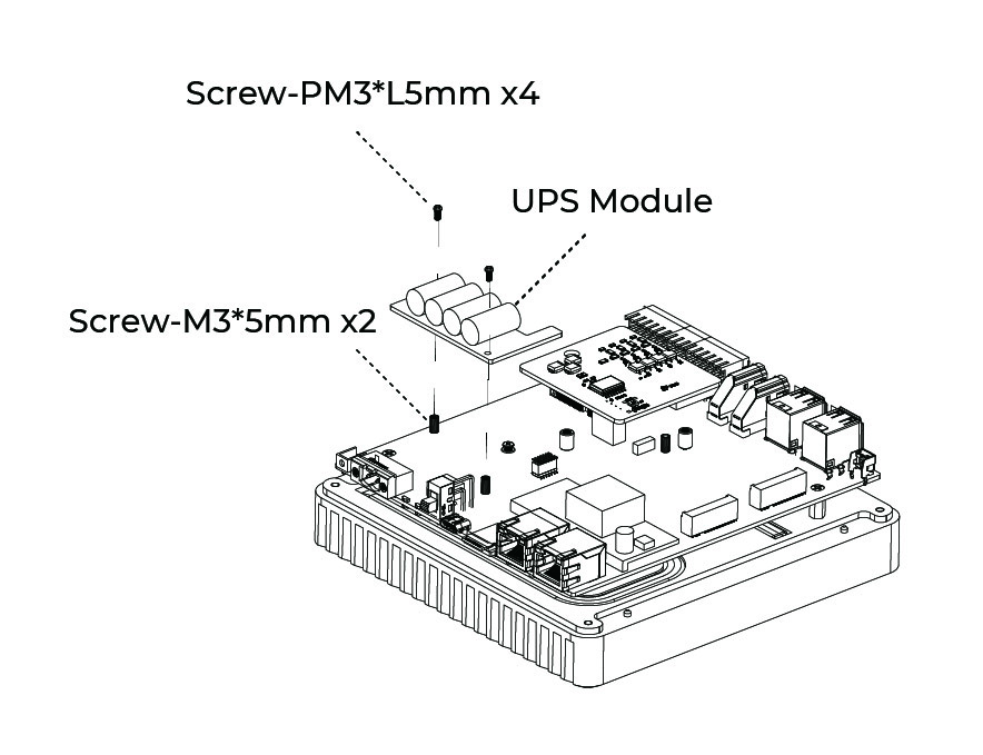 - Using two PM2.0xL5.0 screws and M2.0x5.0 standoffs, secure the UPS module onto two holes without metal contact pads.