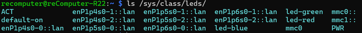 We provide LEDs in three colors of red, blue and green for users to use. You can enter the /sys/class/leds/ directory to view: