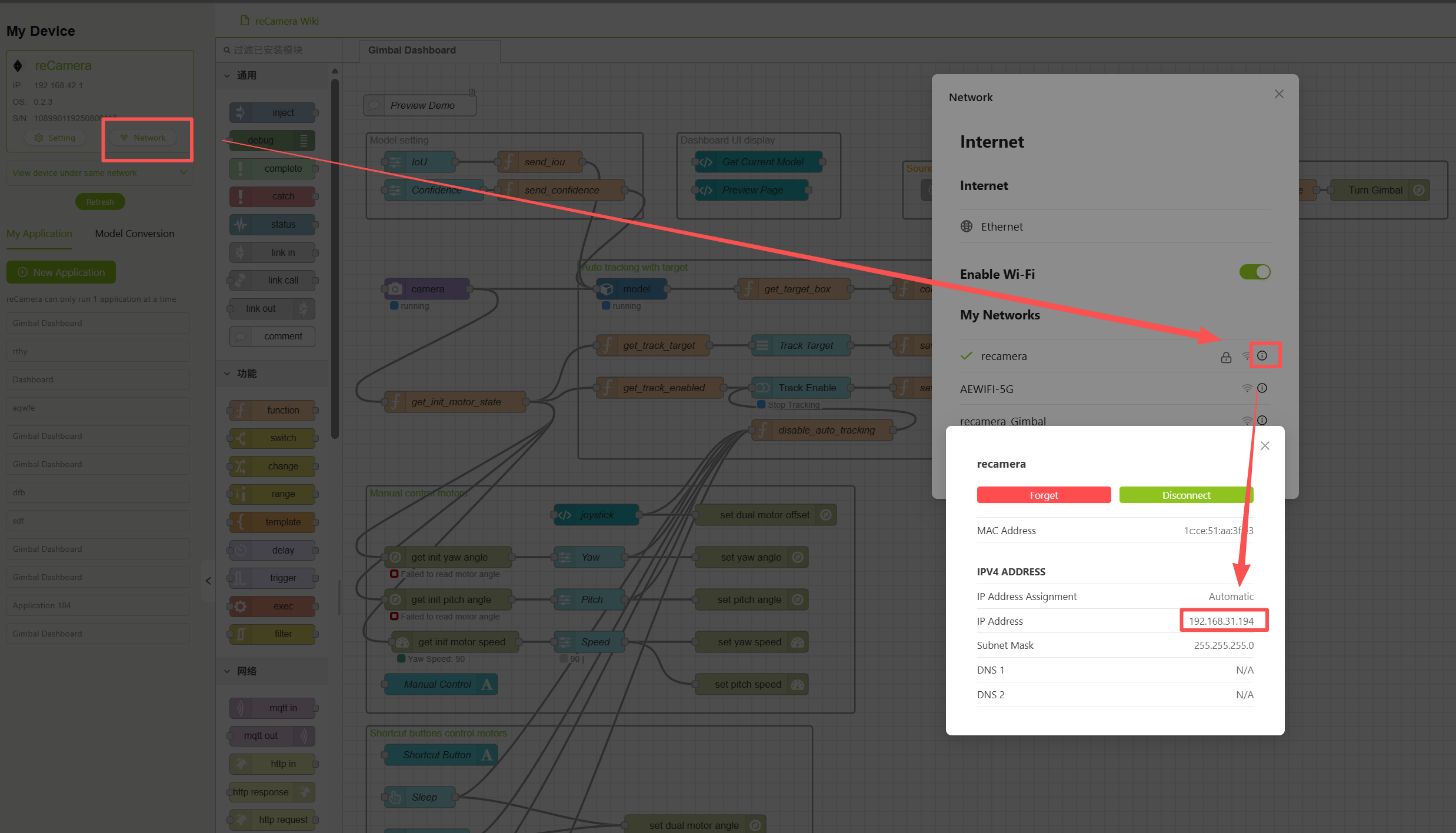 First, do not connect reCamera Gimbal's power supply, directly connect the Type-C to the computer, access 192.168.42.1, click "Login to SenseCraft" in the lower left corner after entering, then connect WiFi to it after logging in, make sure that the connected WiFi is the same as your computer, then check the IP address of reCamera Gimbal, copy the IP address and access it to see if it can be accessed normally, then unplug the Type-C cable and insert 12V power supply, after the automatic calibration of reCamera Gimbal is completed, revisit the IP address just now in the browser and enter the interface of reCamera Gimbal to ensure that Node-RED has started to run normally.