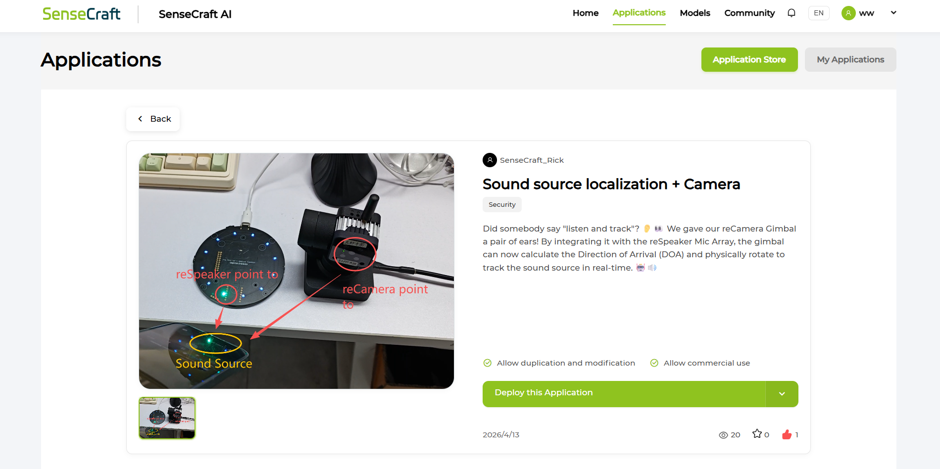 Enter SenseCraft, click "Applications" to find the application named "Sound source localization Camera", click "Deploy this Application" after entering, and then select "Option 1: Deploy via USB"