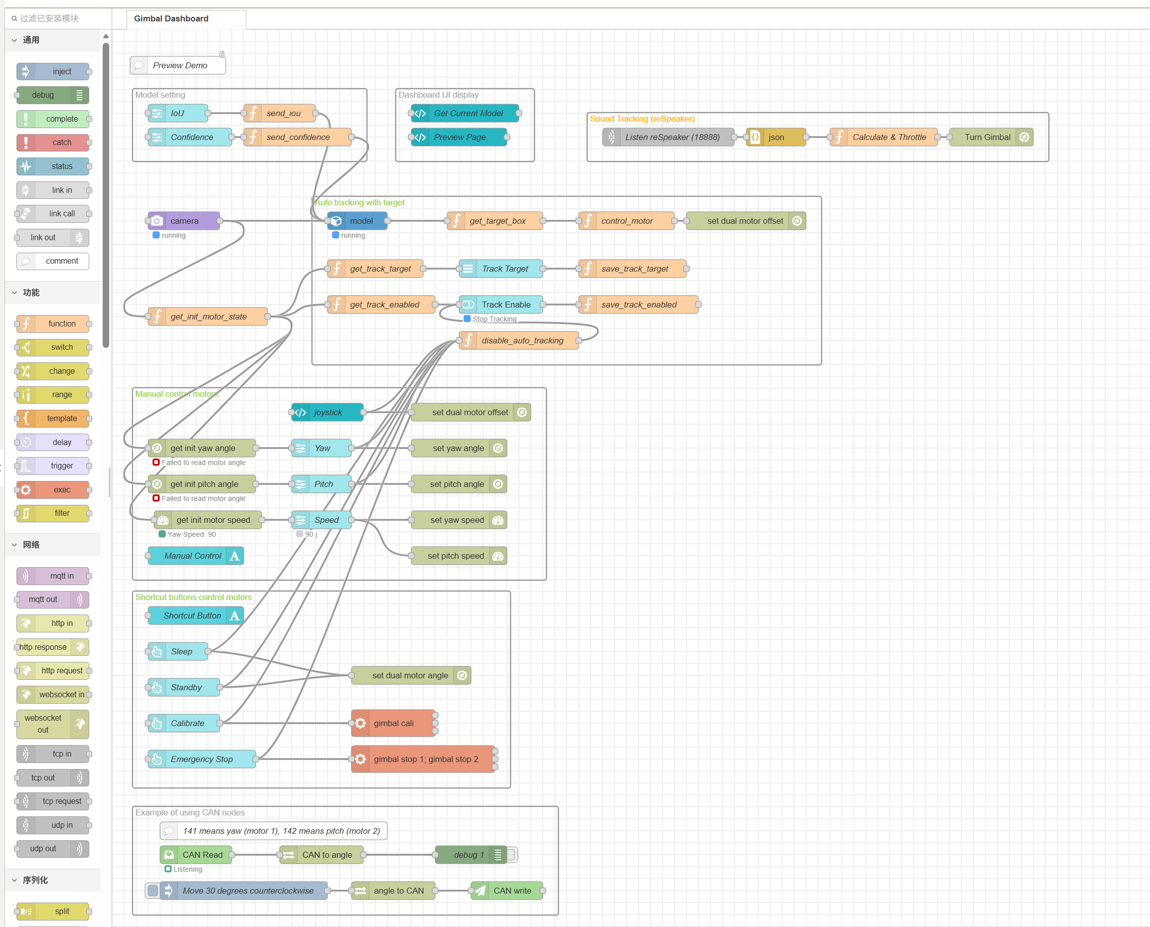 - Anti-shake Design **: Because Python code refreshes and sends data every 0.1 seconds, if all these high-frequency signals are pushed to the motor controller (CAN bus), it is easy to cause the device bus to overload and jam. So I have written the anti-shake logic in the function node of Node-RED (the generator will only be triggered when the angle changes '>5 °' or the time interval '>1 second').