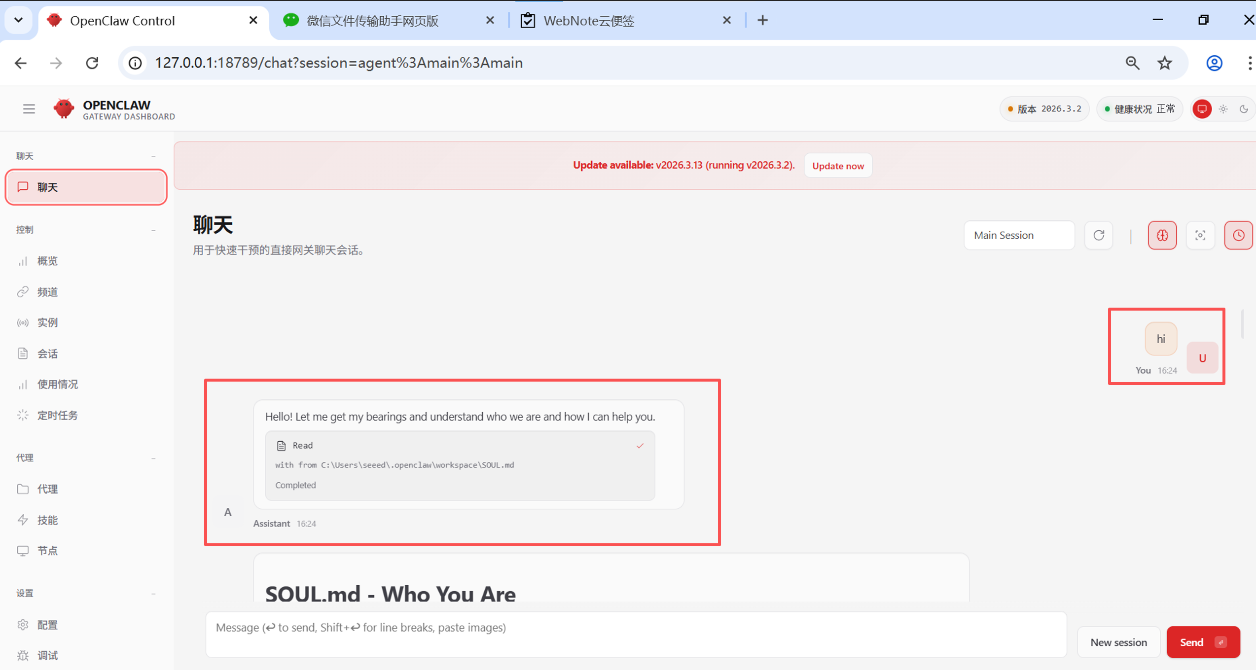 After installation, you can directly enter the web page to try to chat with it. If you can get feedback normally at this time, then you have successfully installed the OpenClaw and configured it. Please go on step by step. If there is a problem with the installation OpenClaw, please find out the reason and solve it yourself.