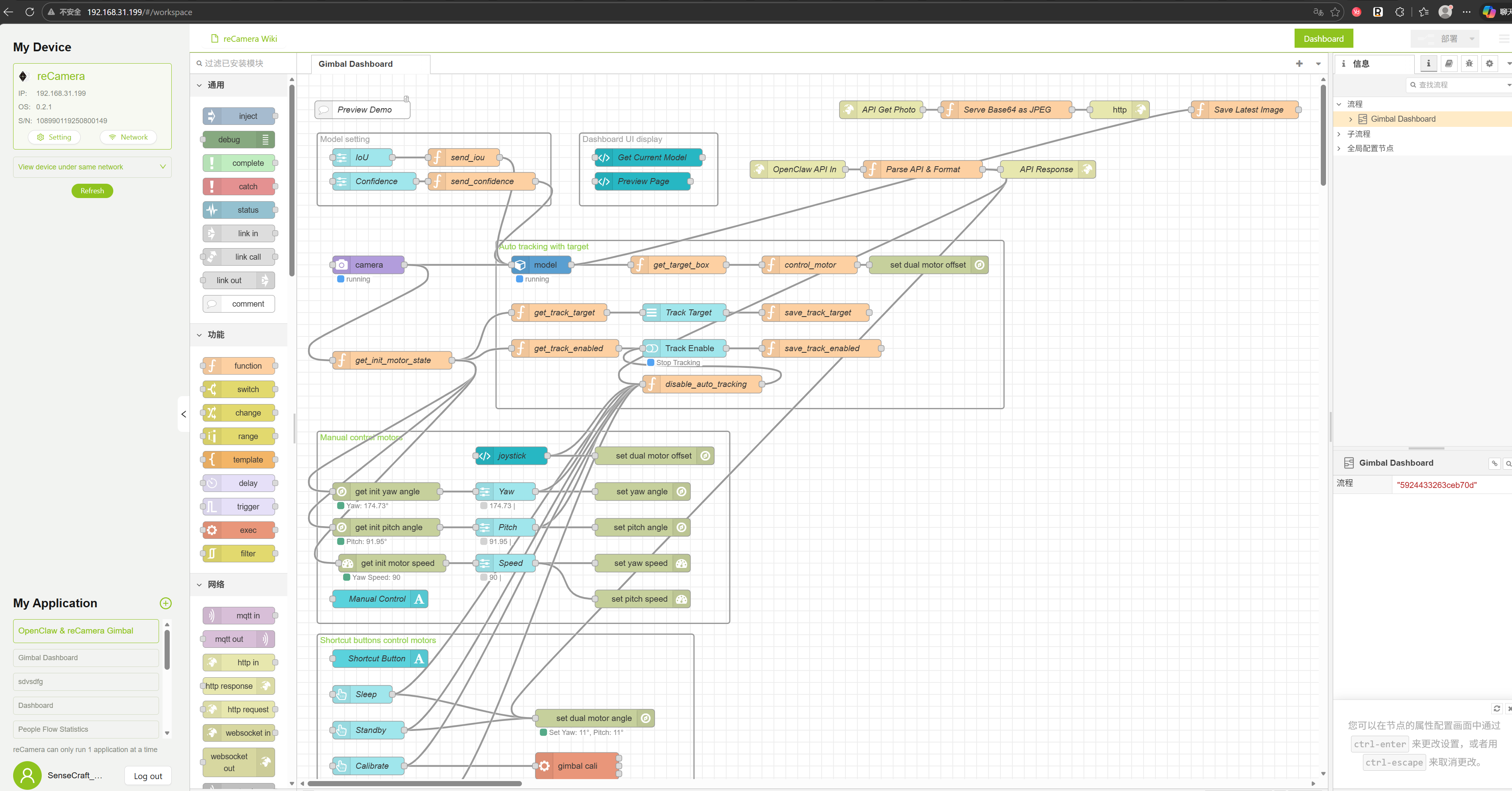 Open the SenseCraftApplication, find the project named "OpenClaw & reCamera Gimbal", click "Deploy Application"-"Visit Workspace Via USB", and the workflow you see after deployment should be as shown in the following figure: