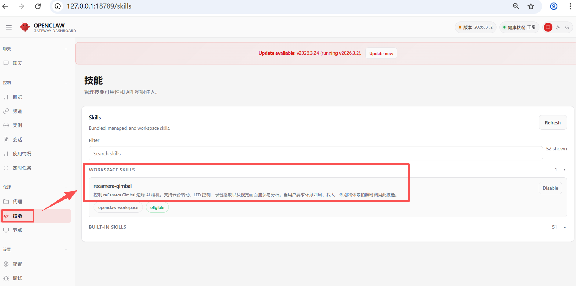 If you have configured Skills according to step 2, in the OpenClaw interface, after clicking "Skills" on the left and then clicking "WORKSPACE SKILLS", you should be able to see the "recamera-gimbal" you have configured locally"