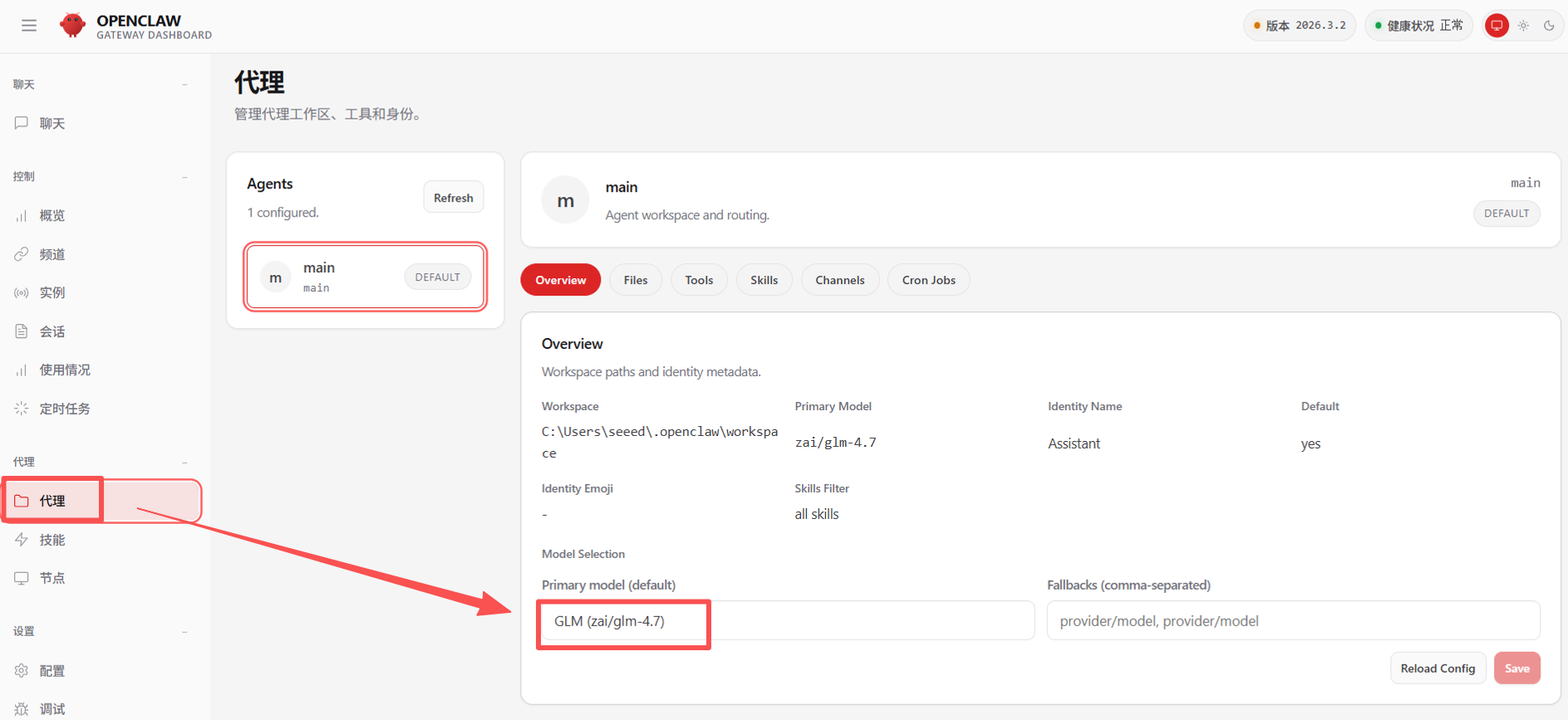 Please make sure your model is configured correctly. After clicking "Agent" on the left, you can see the model you have configured under "Primary model". I am using GLM4.7 model here.