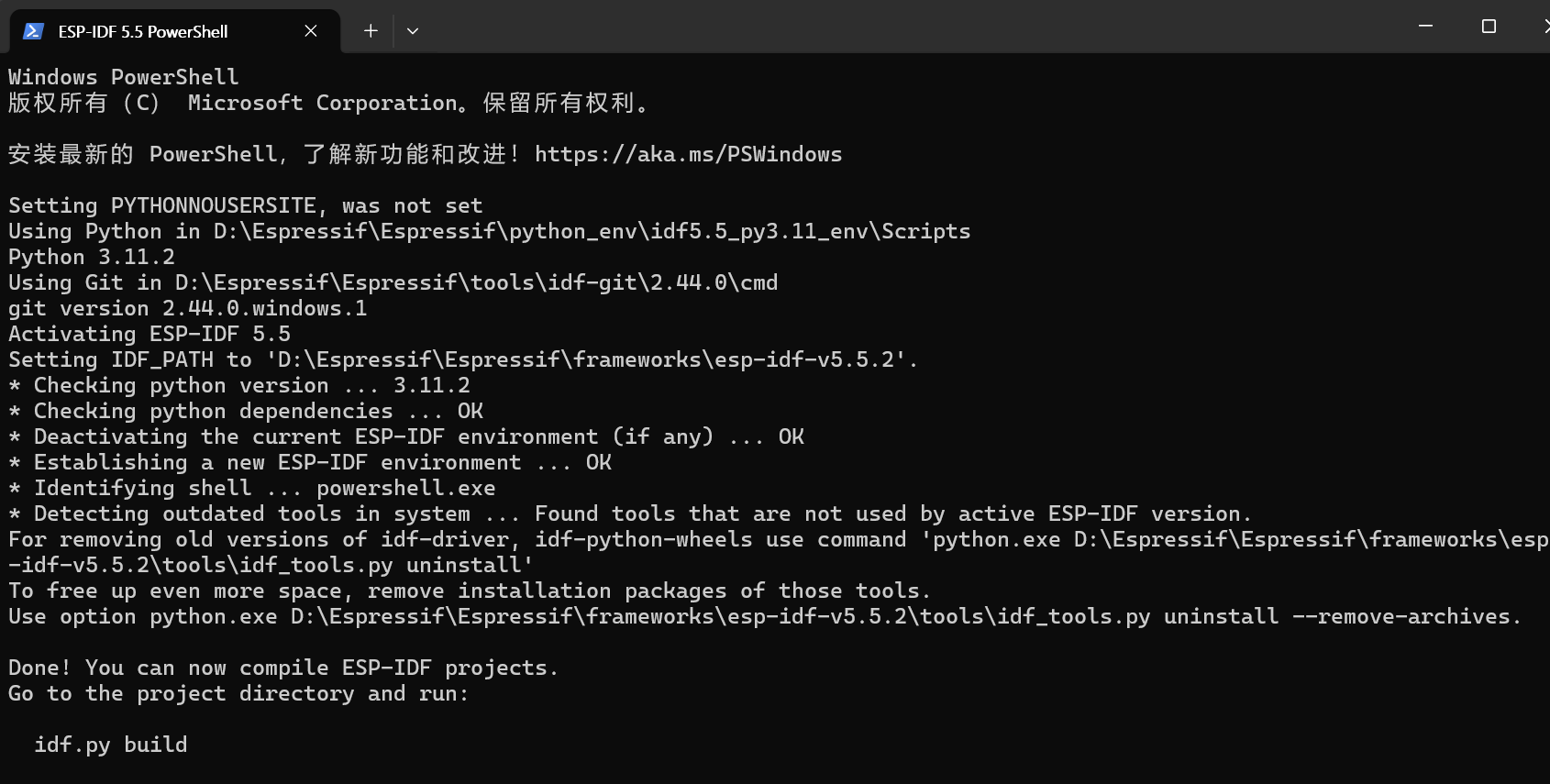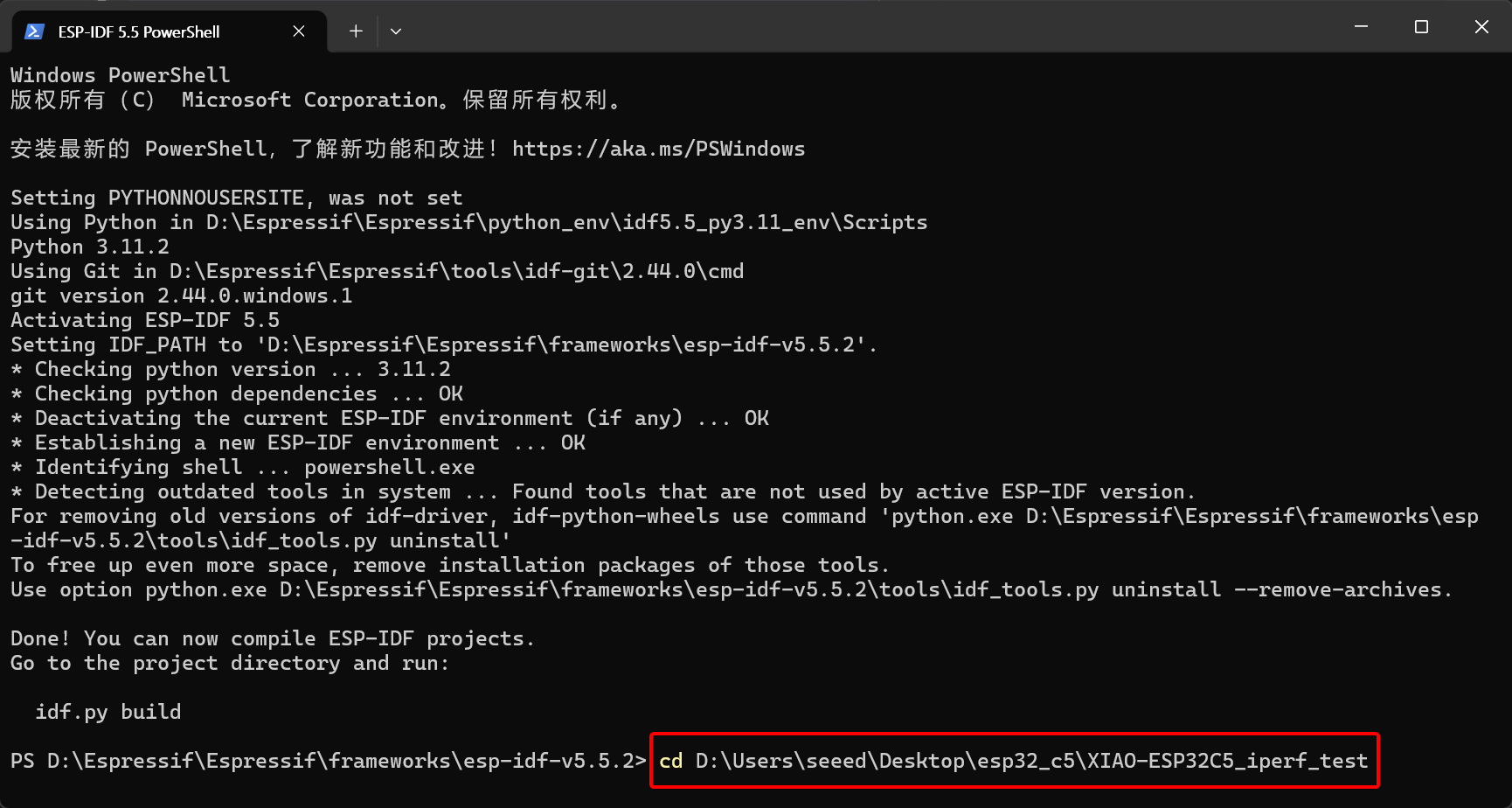 Step 1. Click on ESP-IDF 5.5 PowerShell on the desktop; an environment check will then be performed.