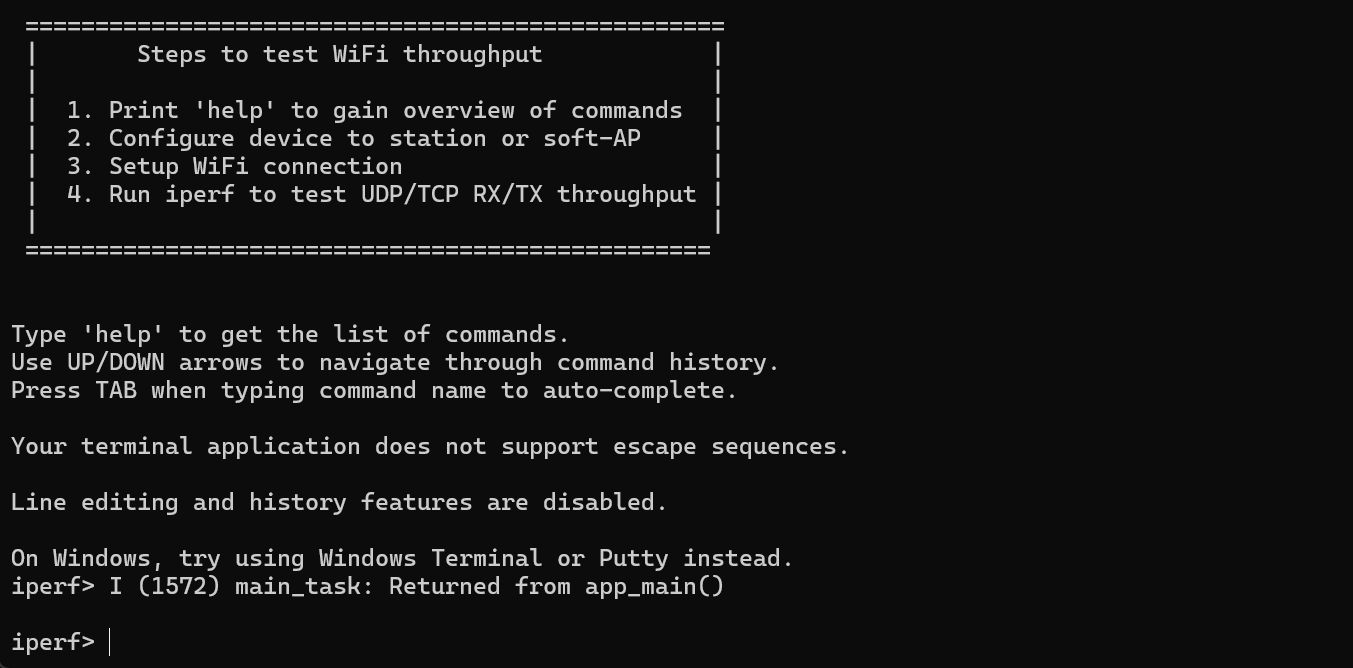 After successful flashing, the terminal will display the iperf> prompt.