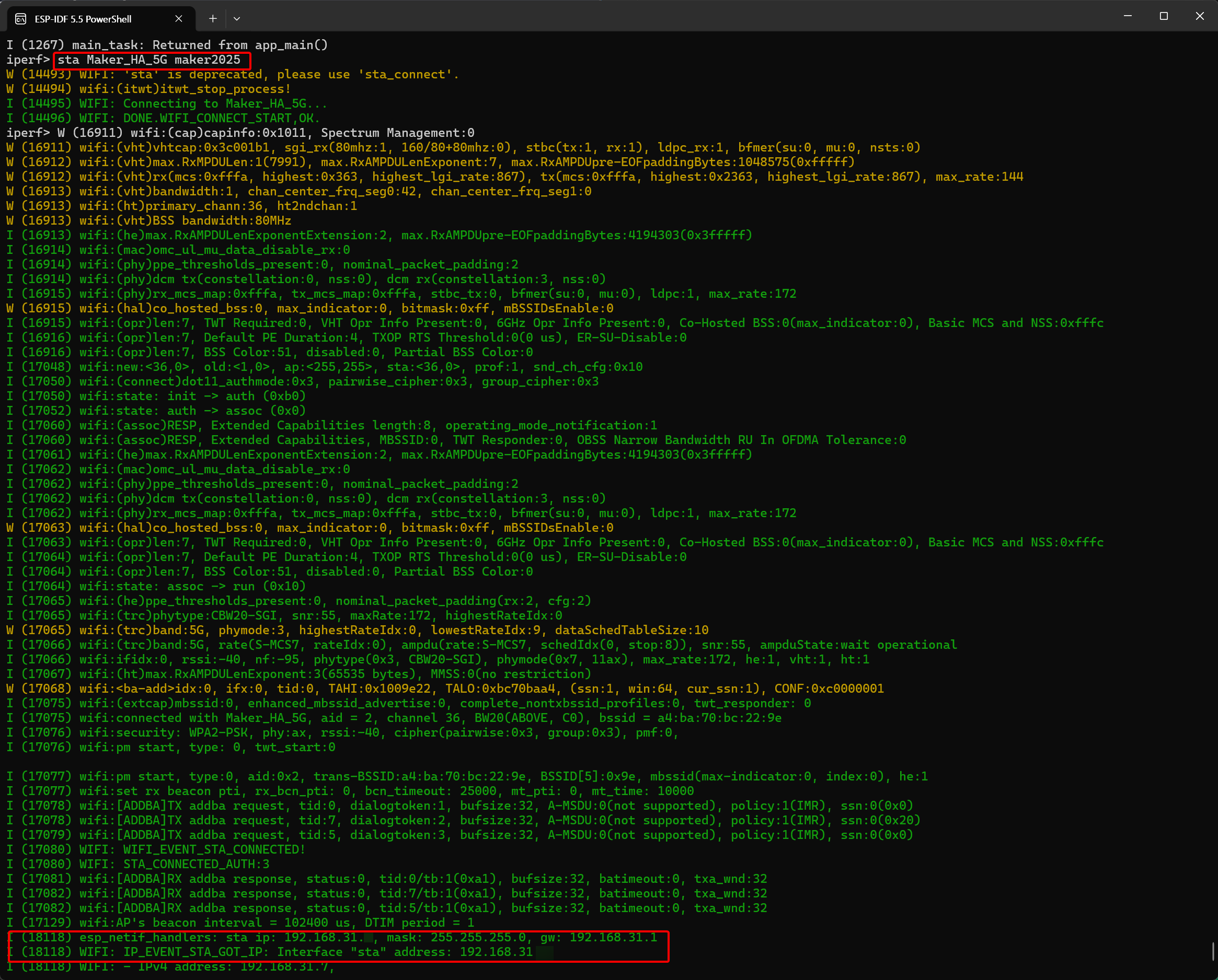 The terminal will then print the Wi-Fi connection information. You need to note down the IP address of the XIAO ESP32-C5.