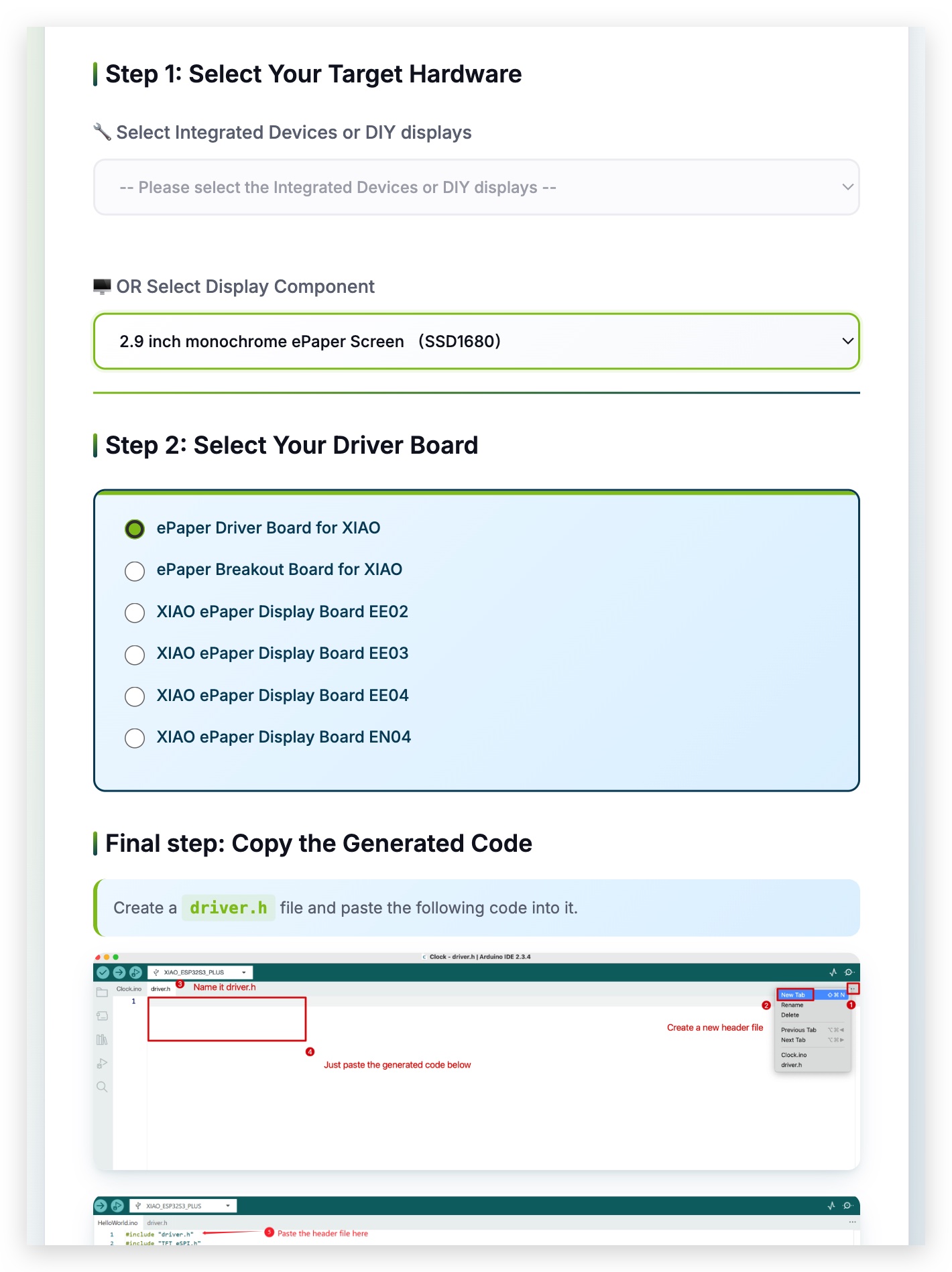 To use the XIAO eInk Expansion Board, we need to program the XIAO series. The table of different sizes E-paper supported by XIAO is as follows: