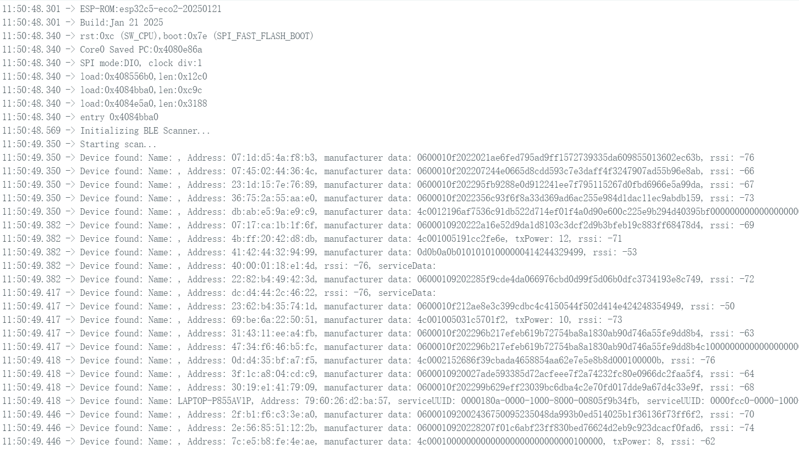 - Upload the code and open the Serial Monitor; the XIAO ESP32-C5 will scan for Bluetooth devices in the surrounding environment and print the relevant information.
