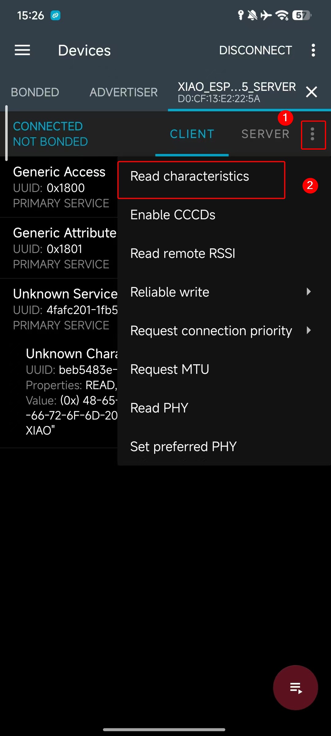 In BLE Client mode, the Client scans for a specific Service UUID, initiates a connection after finding the Server, and reads or writes the characteristic values of the Server.