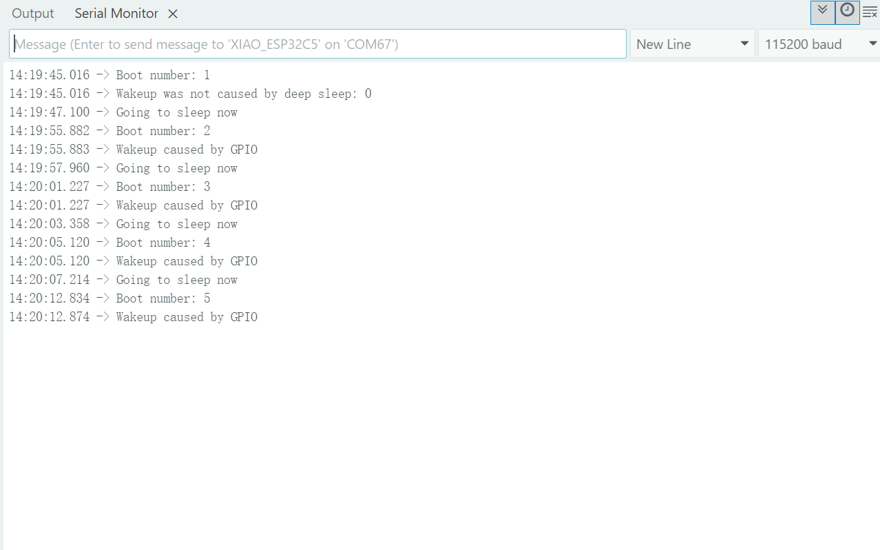 If you are quick enough to turn on the serial monitor before the XIAO goes into deep sleep, then you can see the message output as shown below. This means that the XIAO is now asleep. Then you can also view and activate it by pressing the button.You can also observe the on-off state of the L LED to check if the device has been awakened. Once it is awakened, it will exhibit a flashing effect.