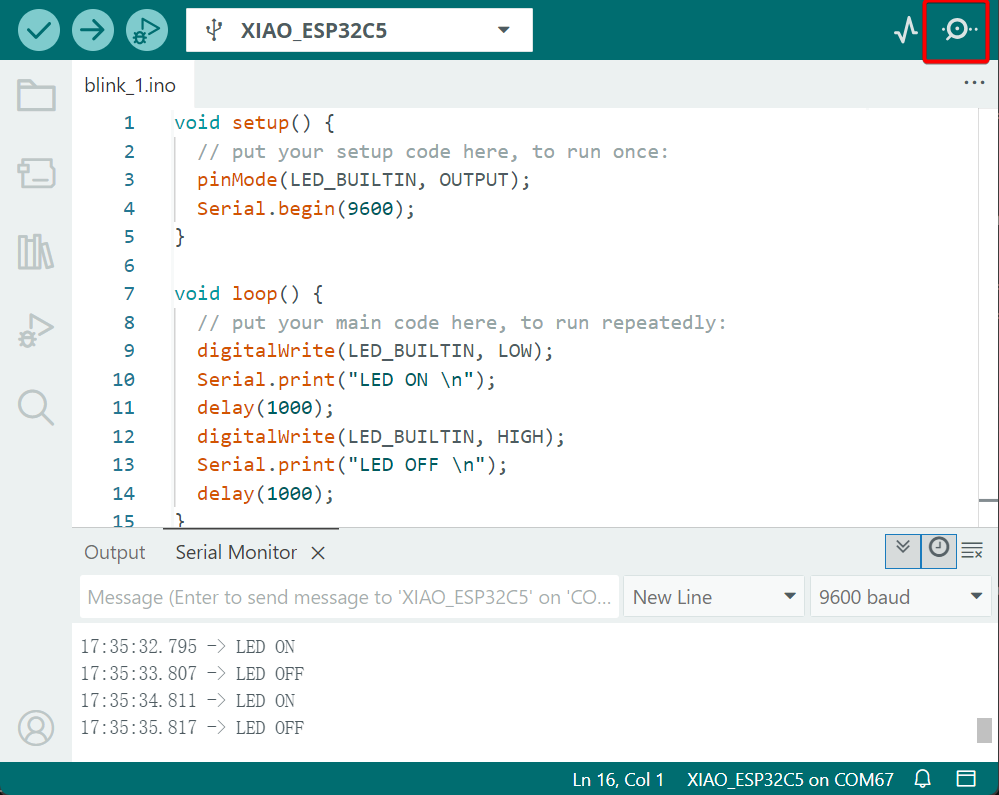 After you upload the program, you will see the L indicator light flashing at intervals of 1 second, and at the same time, the serial monitor will print LED ON and LED OFF.