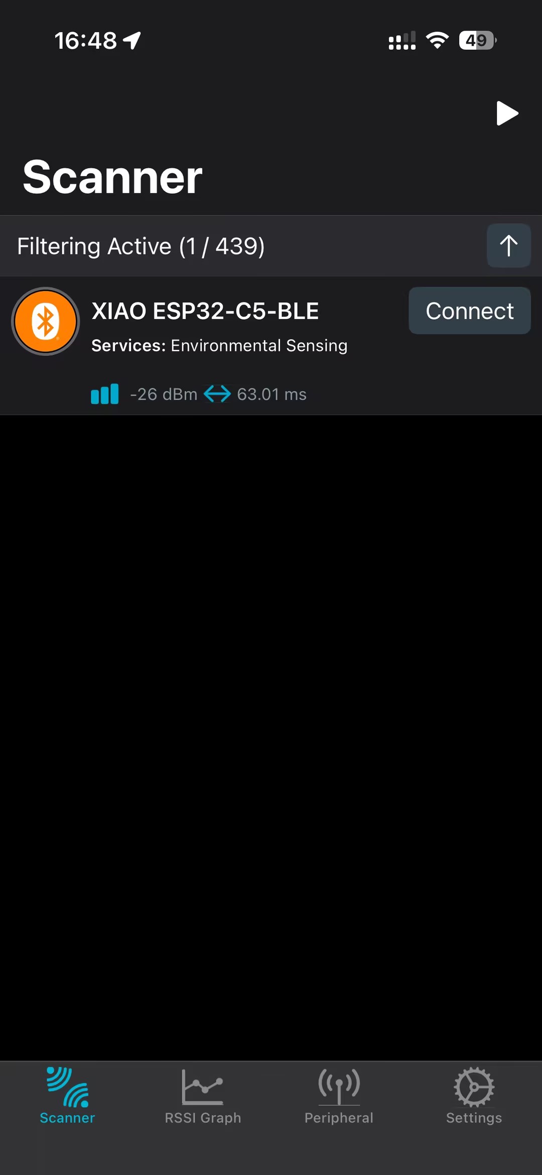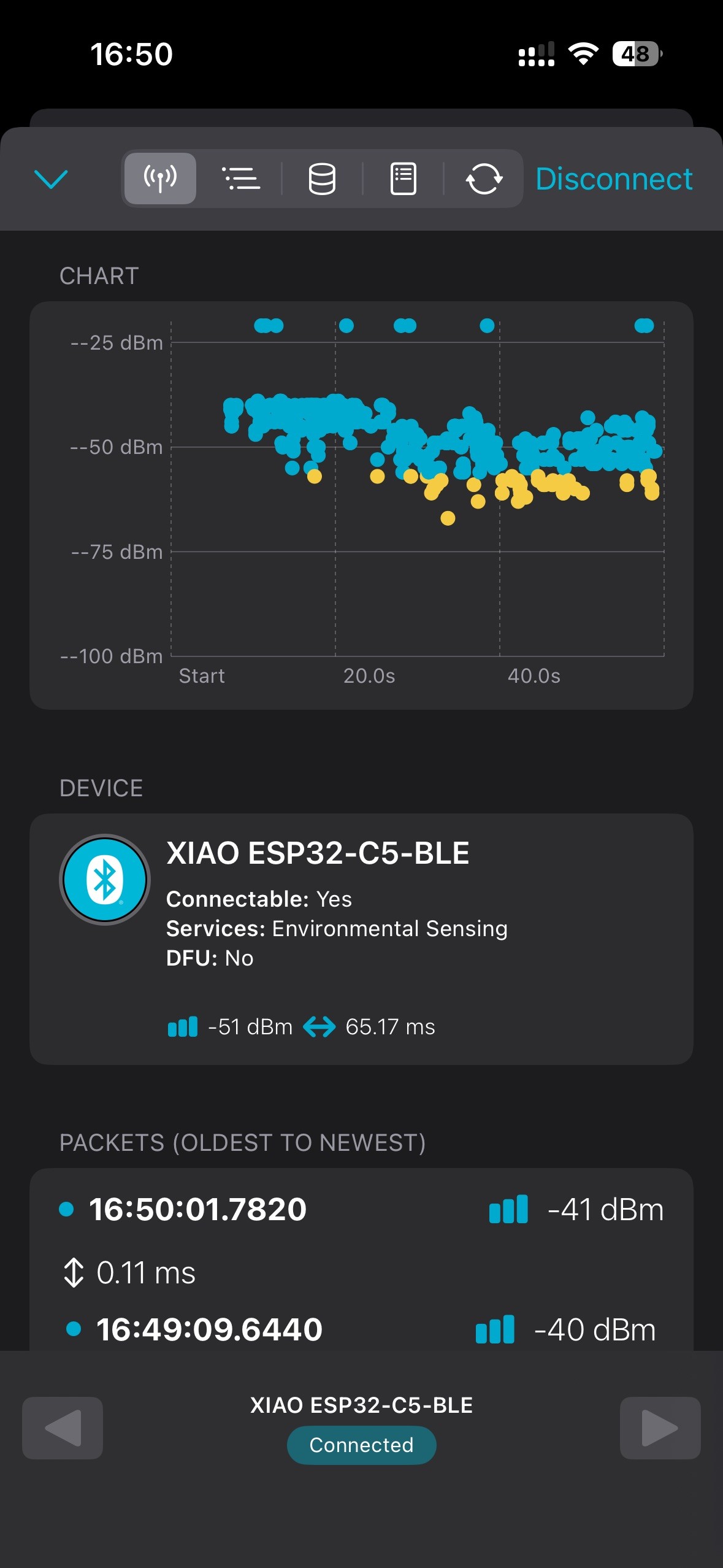 - Then run the code, open the nRF Connect app on your phone, and you will discover the device named XIAO ESP32-C5-BLE. After a successful connection, the onboard L LED will light up, and the transmission count information will also be printed at that time.