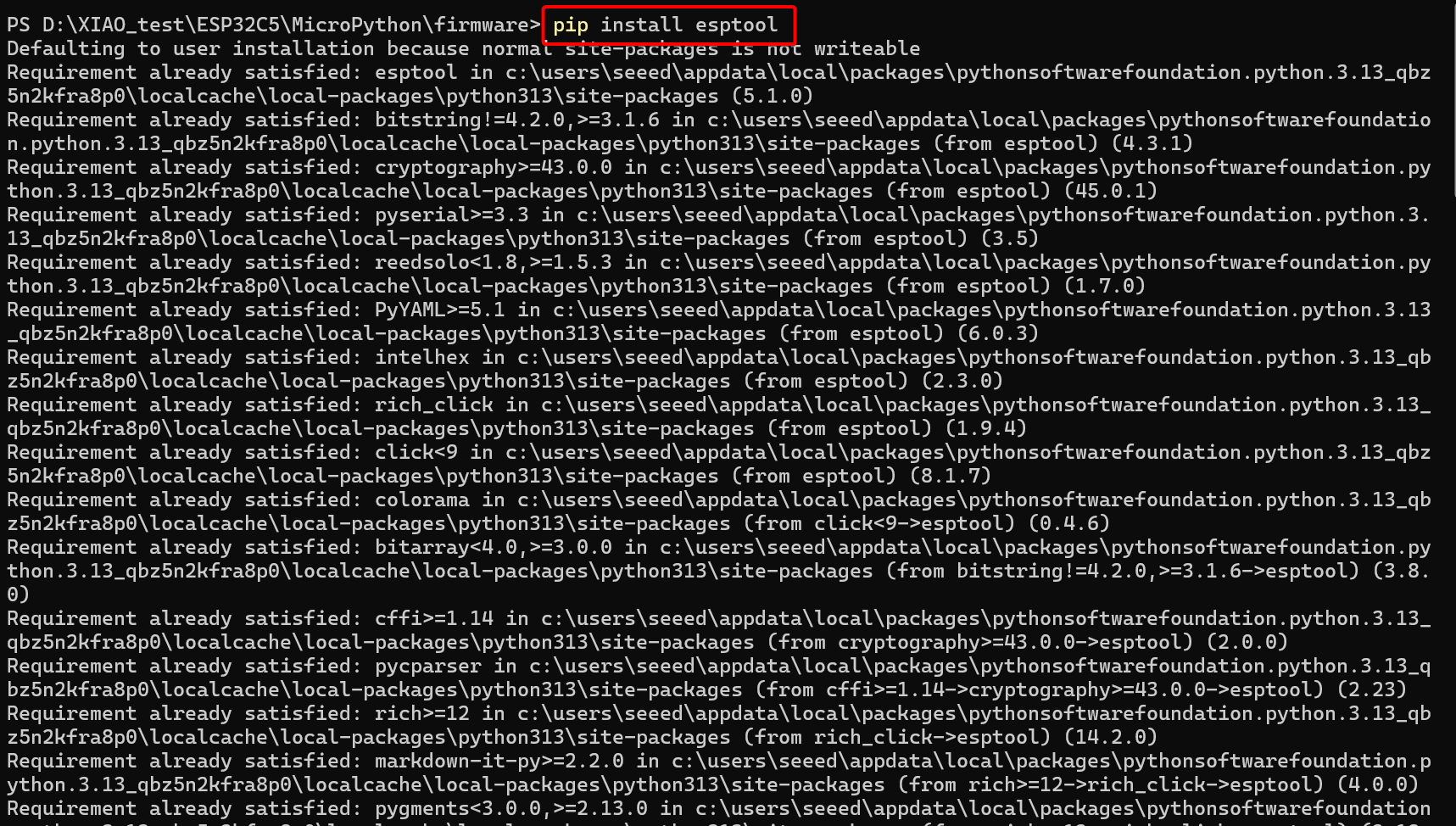 Before installing the MicroPython firmware for the ESP32-C5, you need to install esptool first. We will use esptool.py to erase and flash the firmware onto the development board.