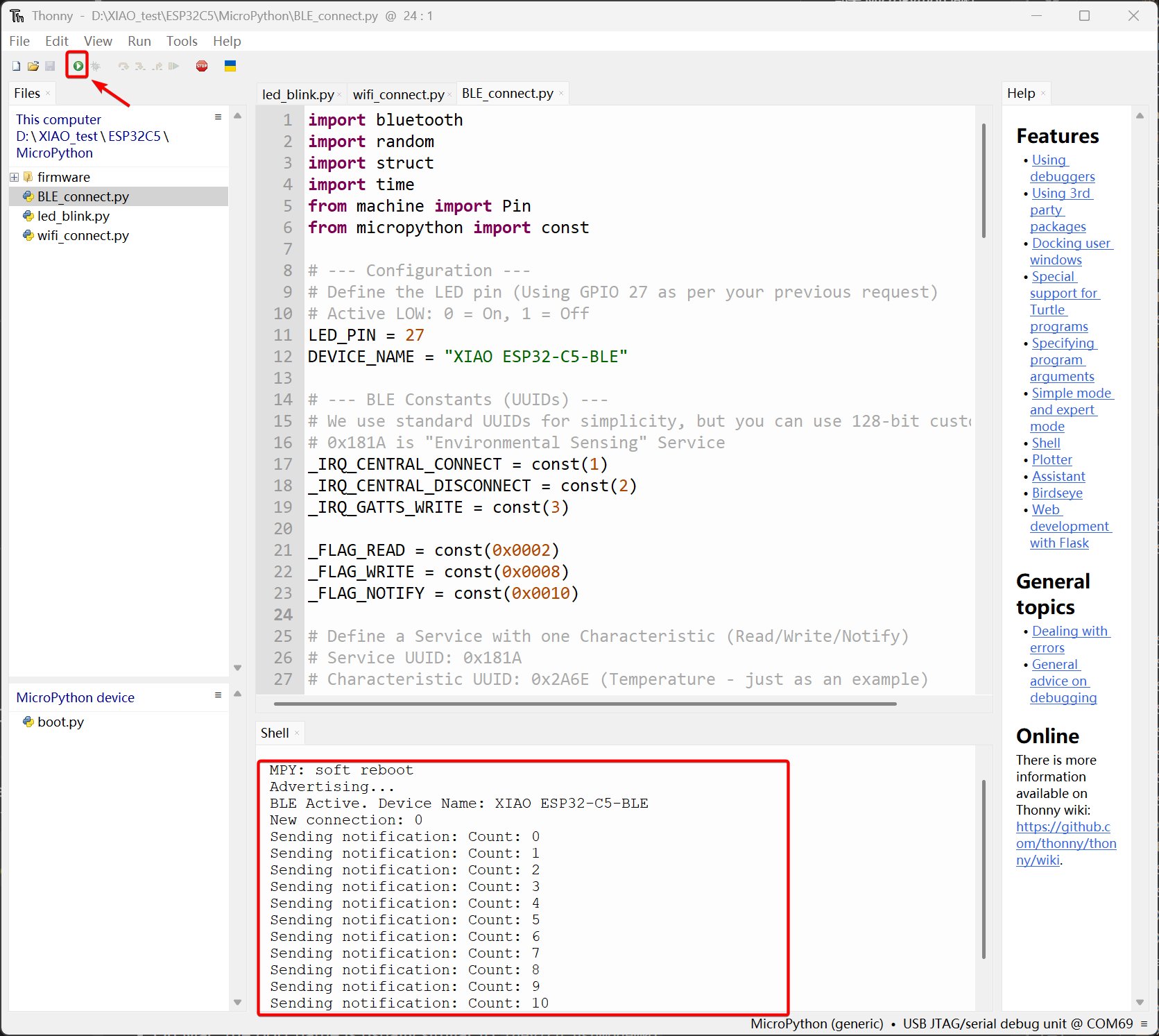 After a successful connection, the MicroPython firmware version information will be output in the shell window below.