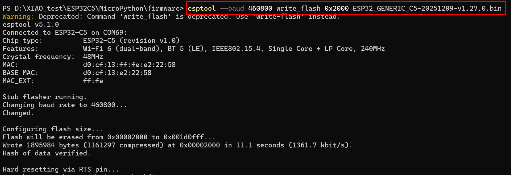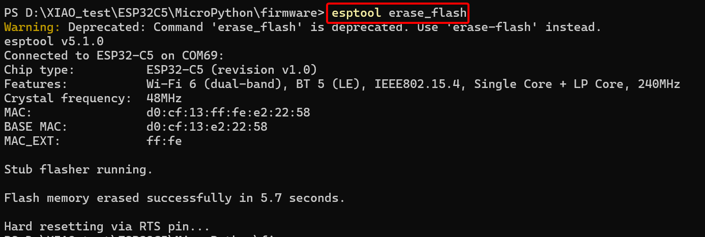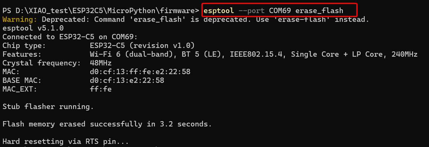 If you are installing MicroPython on the XIAO ESP32-C5 for the first time, use the following command to erase the Flash first.