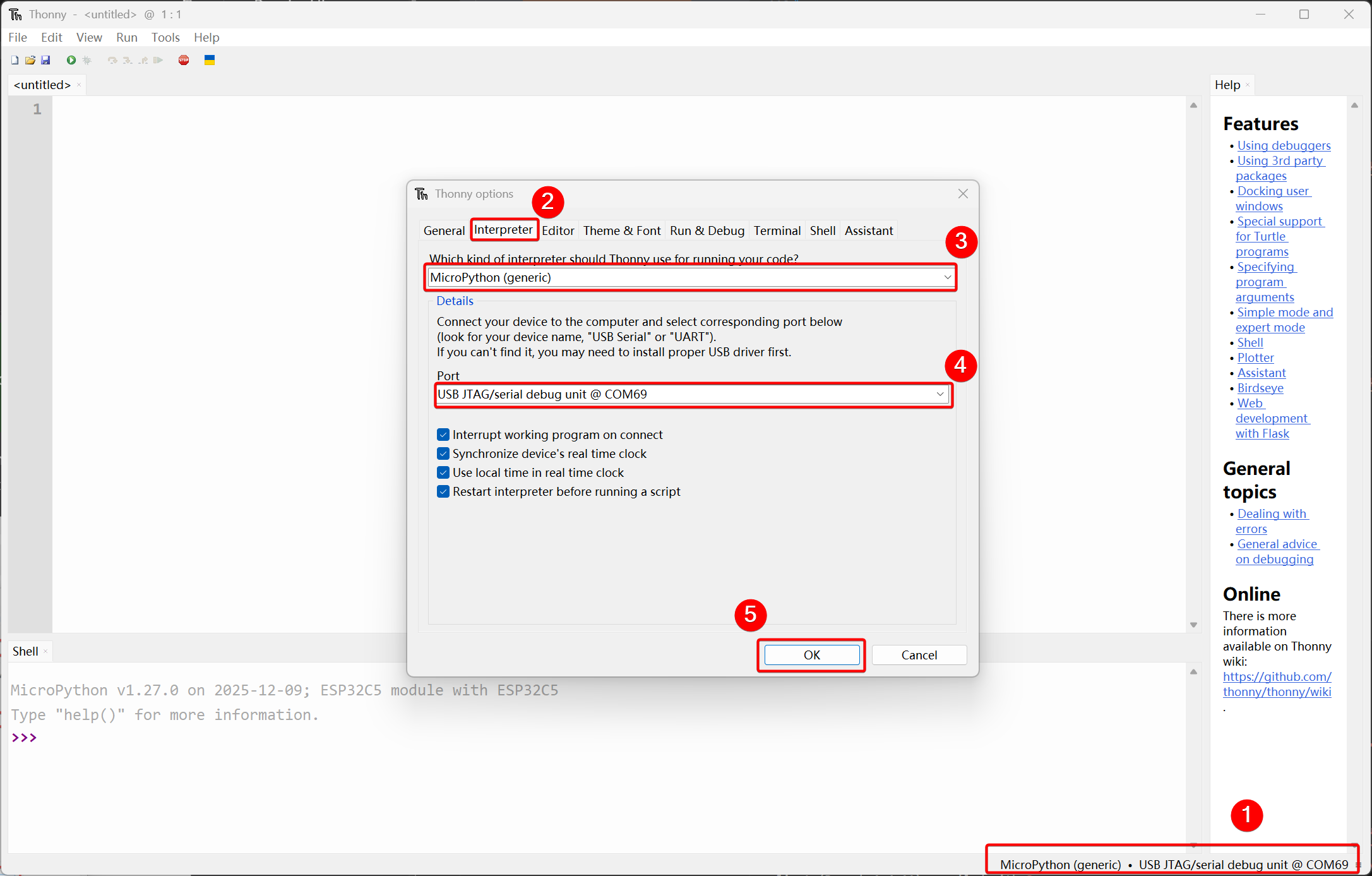 - Open Thonny IDE, then click the bottom right corner of the interface to Configure interpreter options. Select MicroPython (generic) and Port