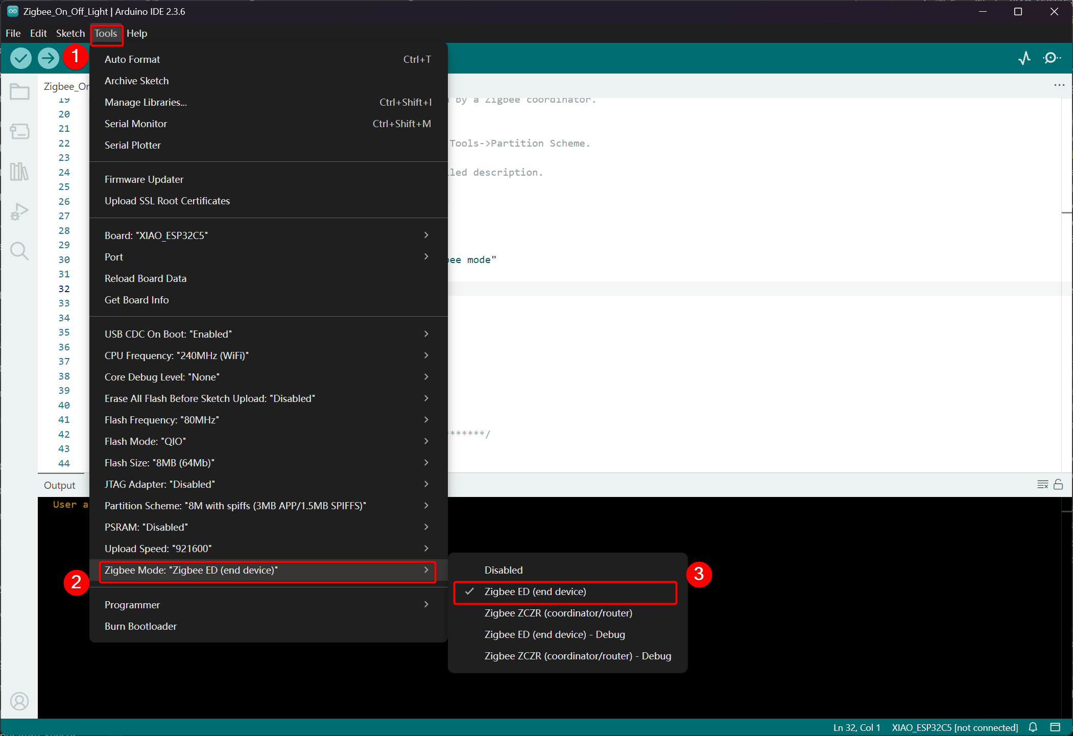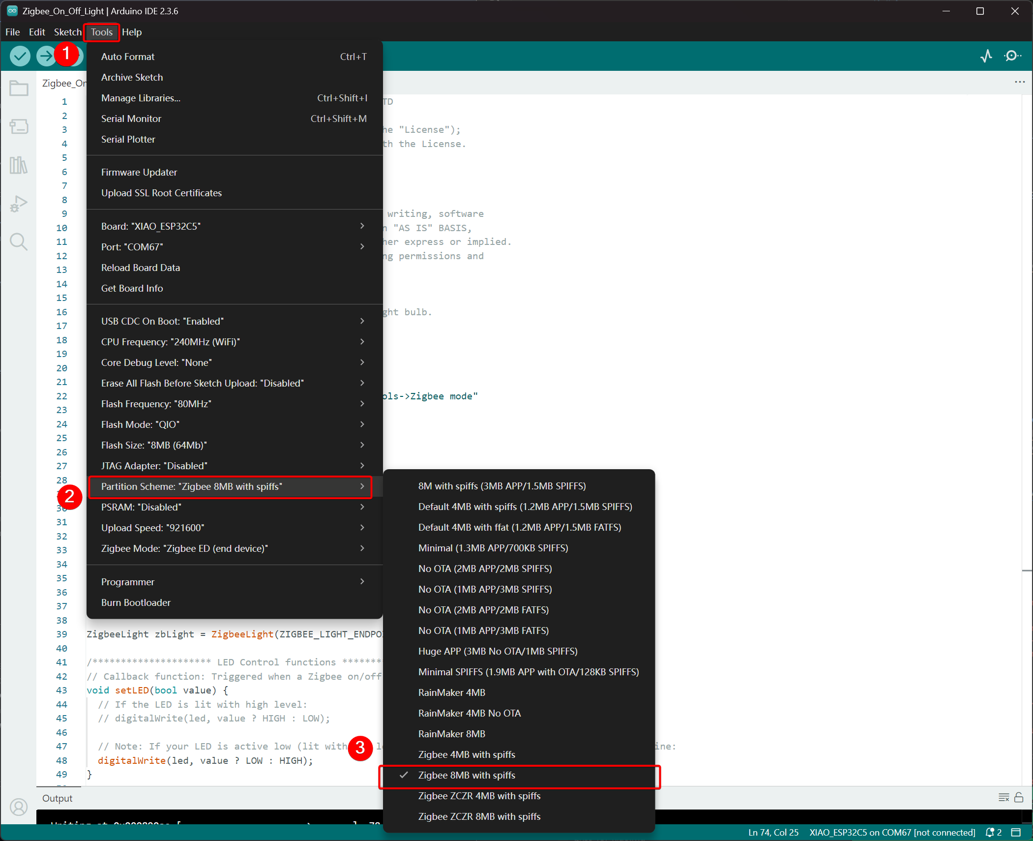 - Select Partition Scheme, go to Tools -> Partition Scheme -> Zigbee 8MB with spiffs