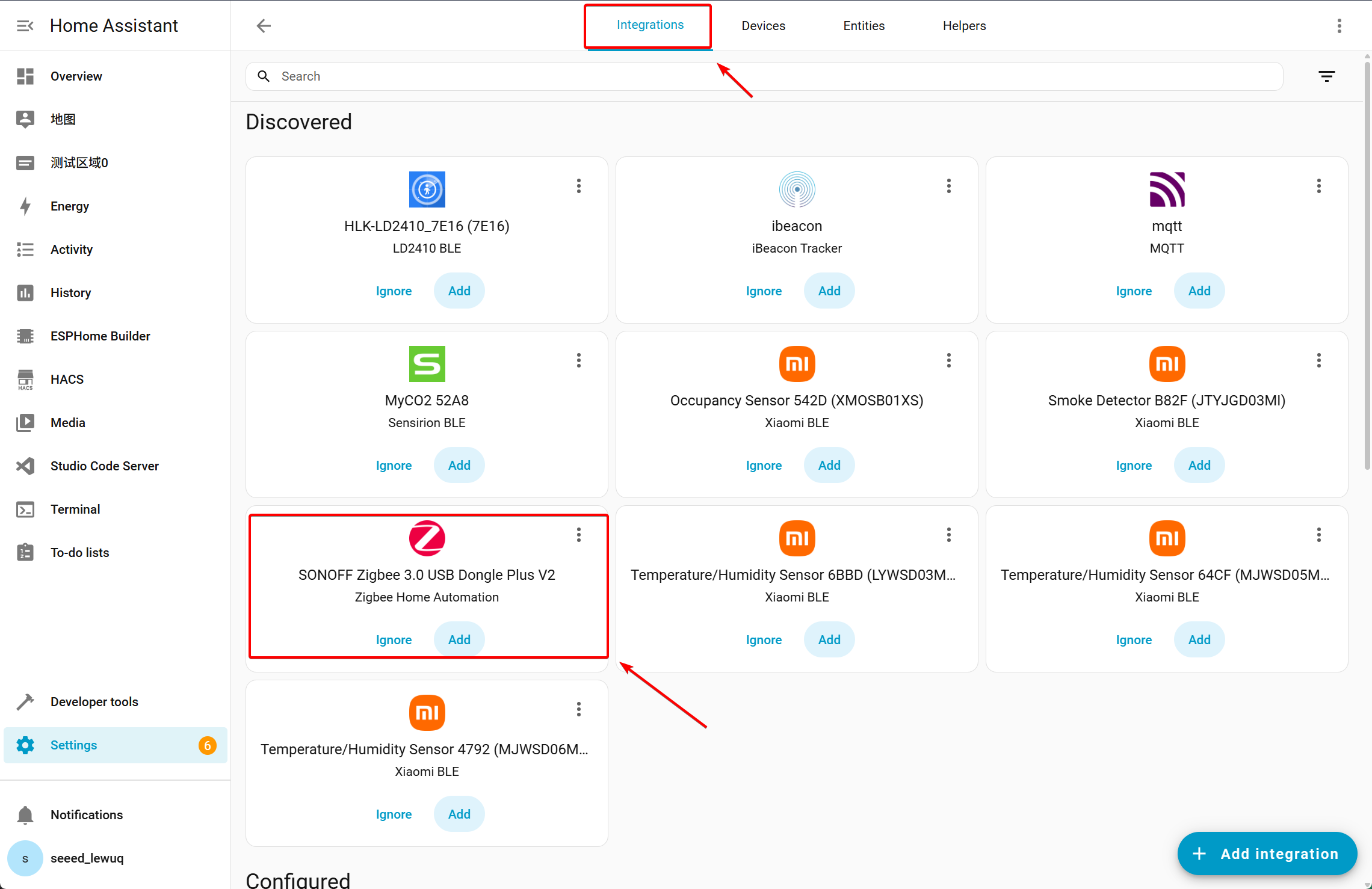 -Under Integrations, you will find the SONOFF Zigbee 3.0 USB Dongle Plus V2 device, it is Sonoff Zigbee 3.0 USB Dongle Plus–ZBDongle-E.