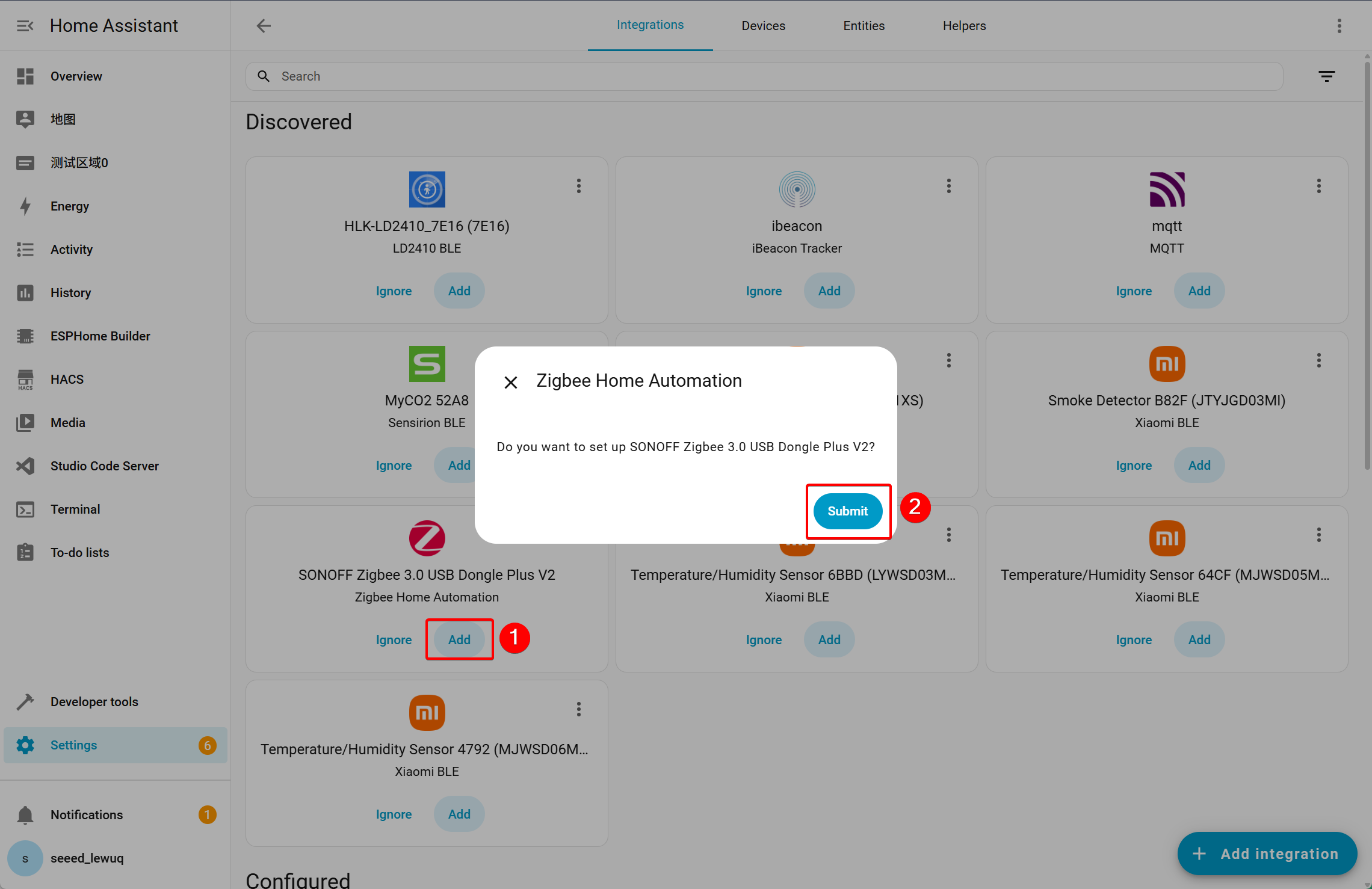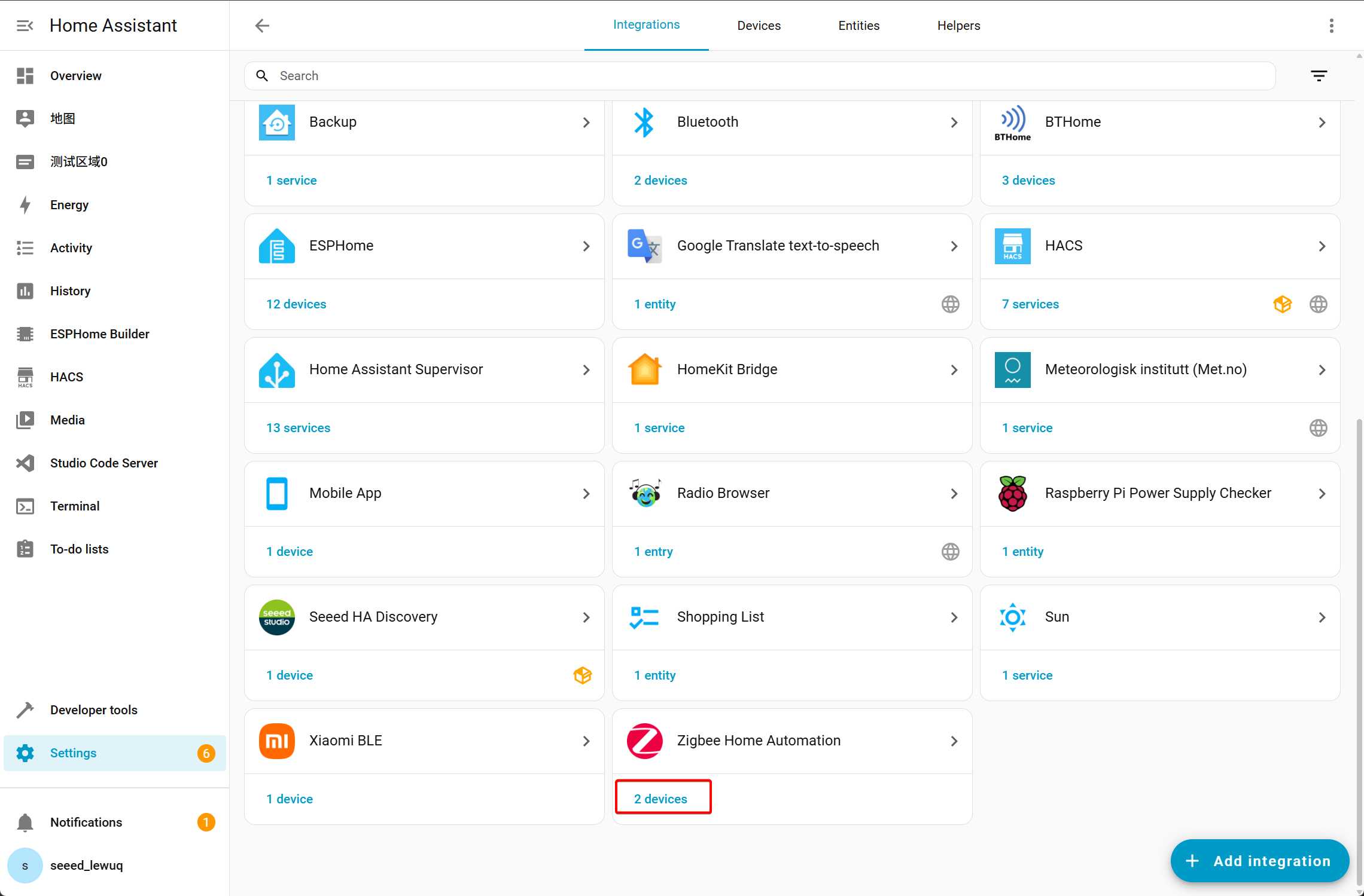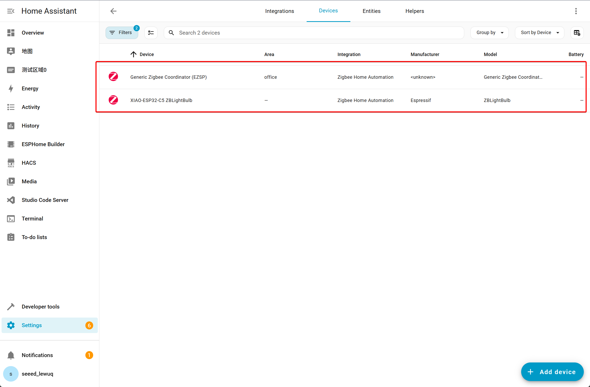 - After flashing the example code to the XIAO ESP32-C5, it will automatically join the Zigbee network. Open the Integrations page, and you will see two Zigbee devices appear.