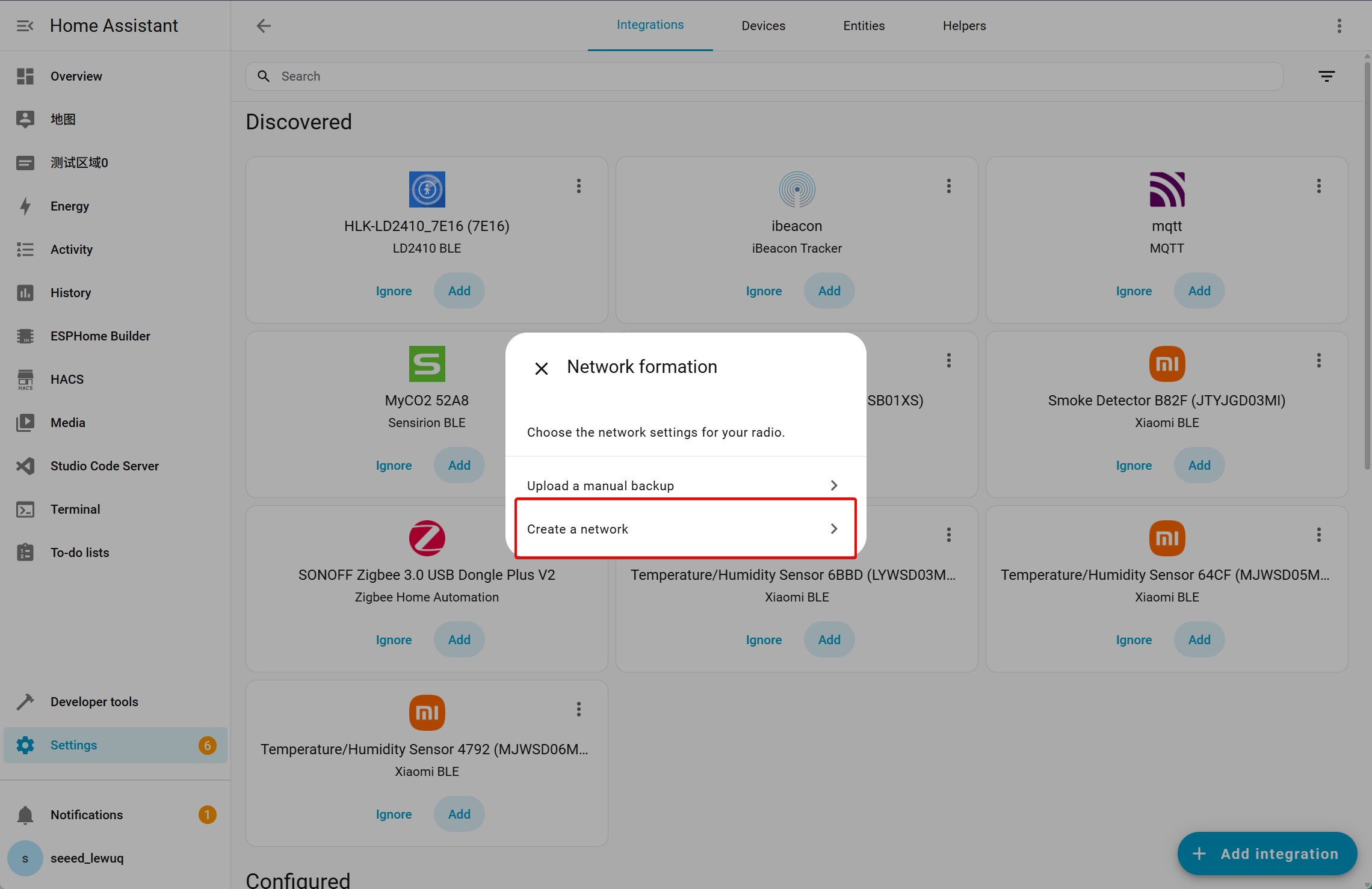 - After clicking Submit, you will be prompted to select the Zigbee device mode. Choose to create a Zigbee network in Home Assistant.