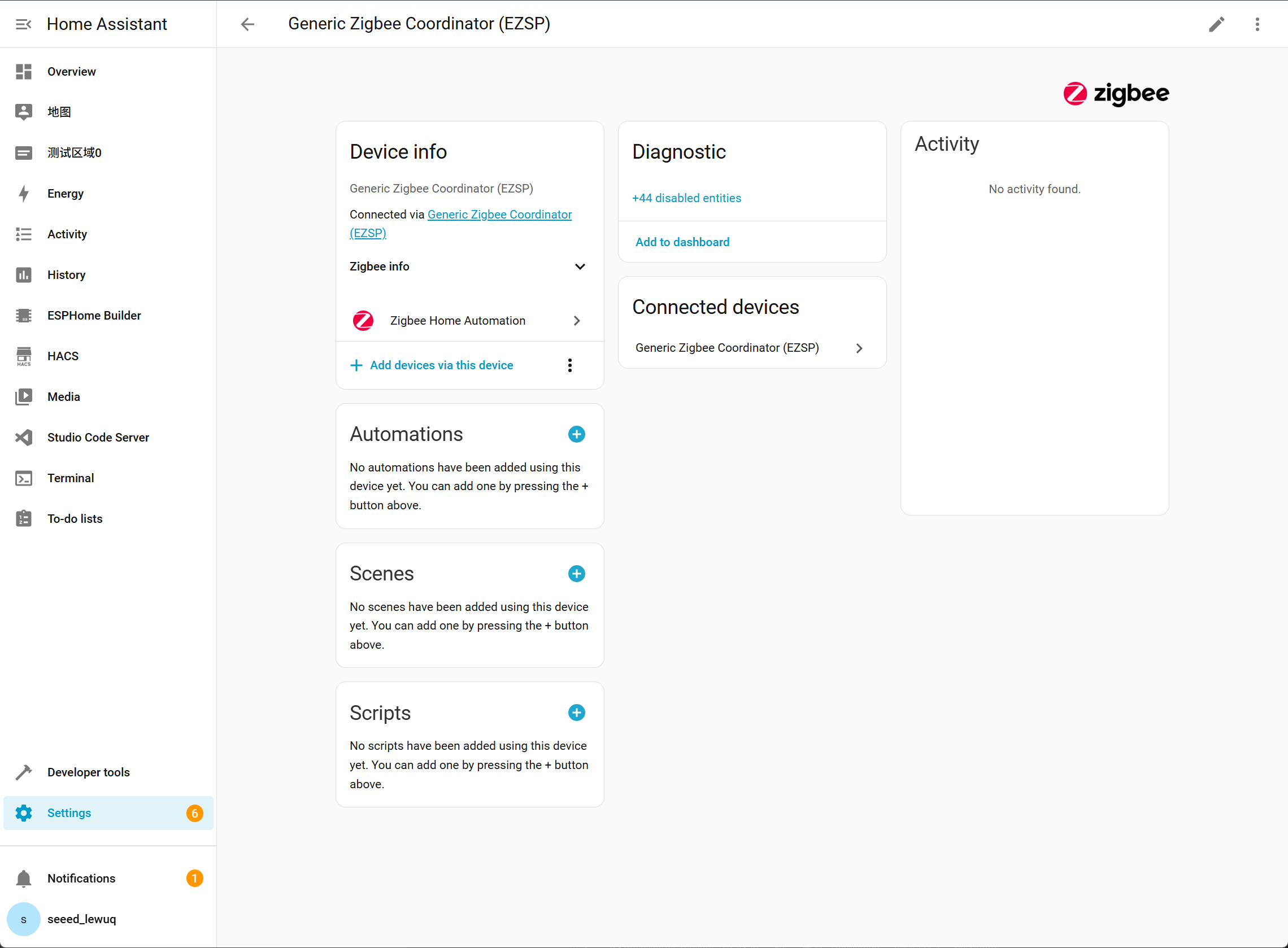 - The ZBDongle-E is set as the coordinator, which can control Zigbee end devices.