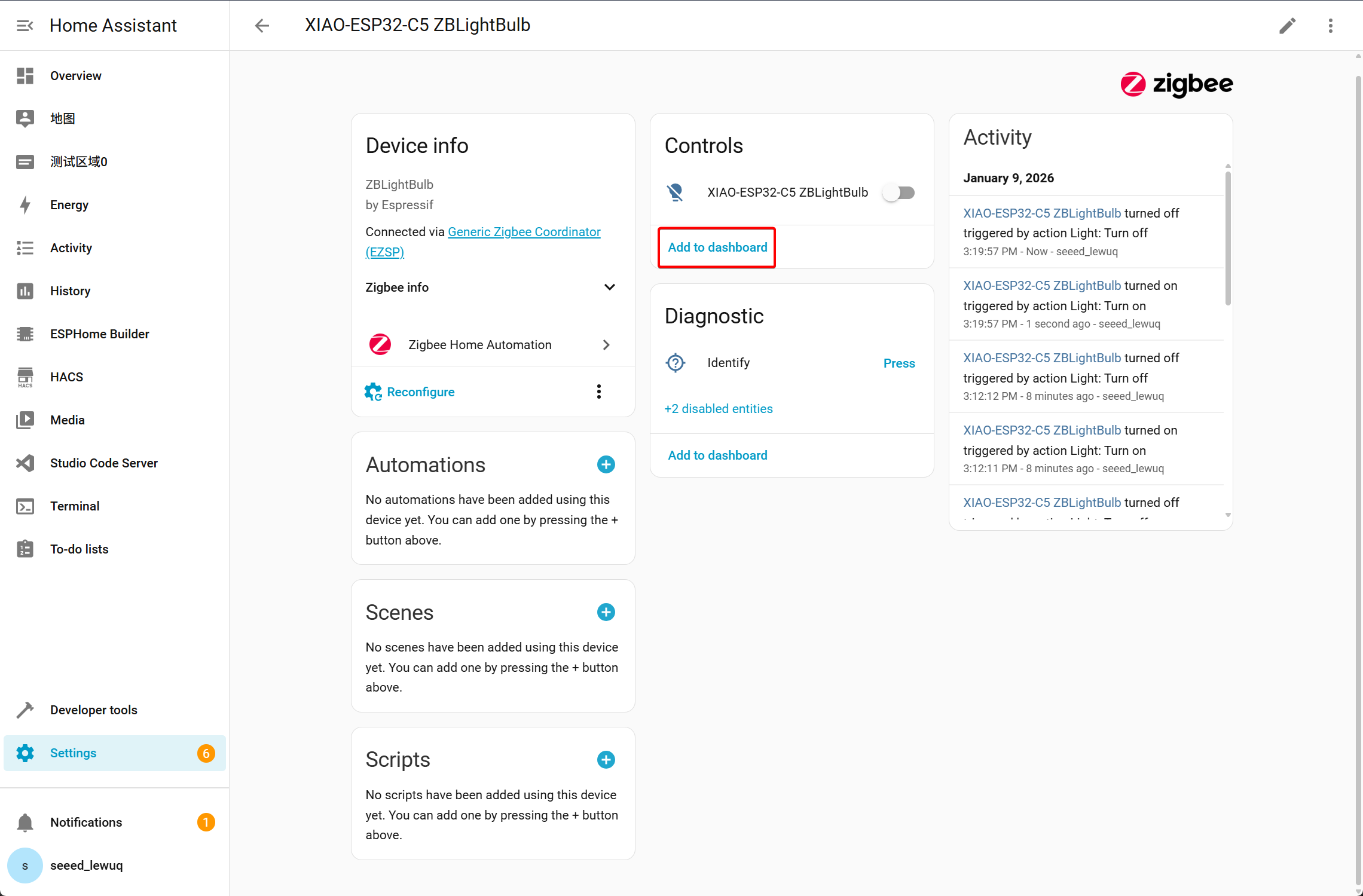 - Click on the XIAO-ESP32-C5 ZBLightBulb device and add it to the dashboard.