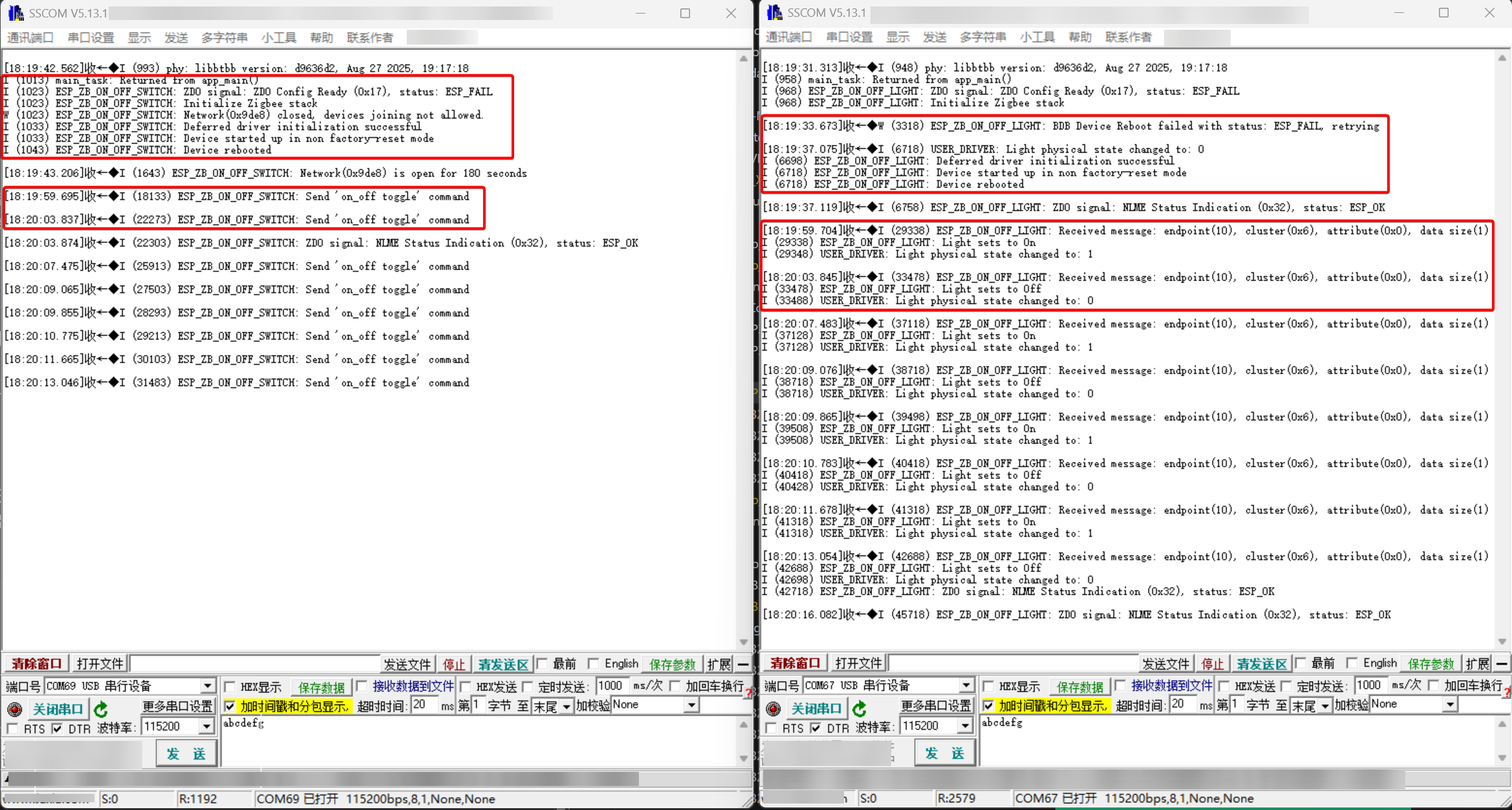 - The serial port prints configuration information. After they successfully form a Zigbee network, they will print configuration information, as well as control commands and received commands. The left side shows the HA_on_off_switch device, and the right side shows the HA_on_off_light device.