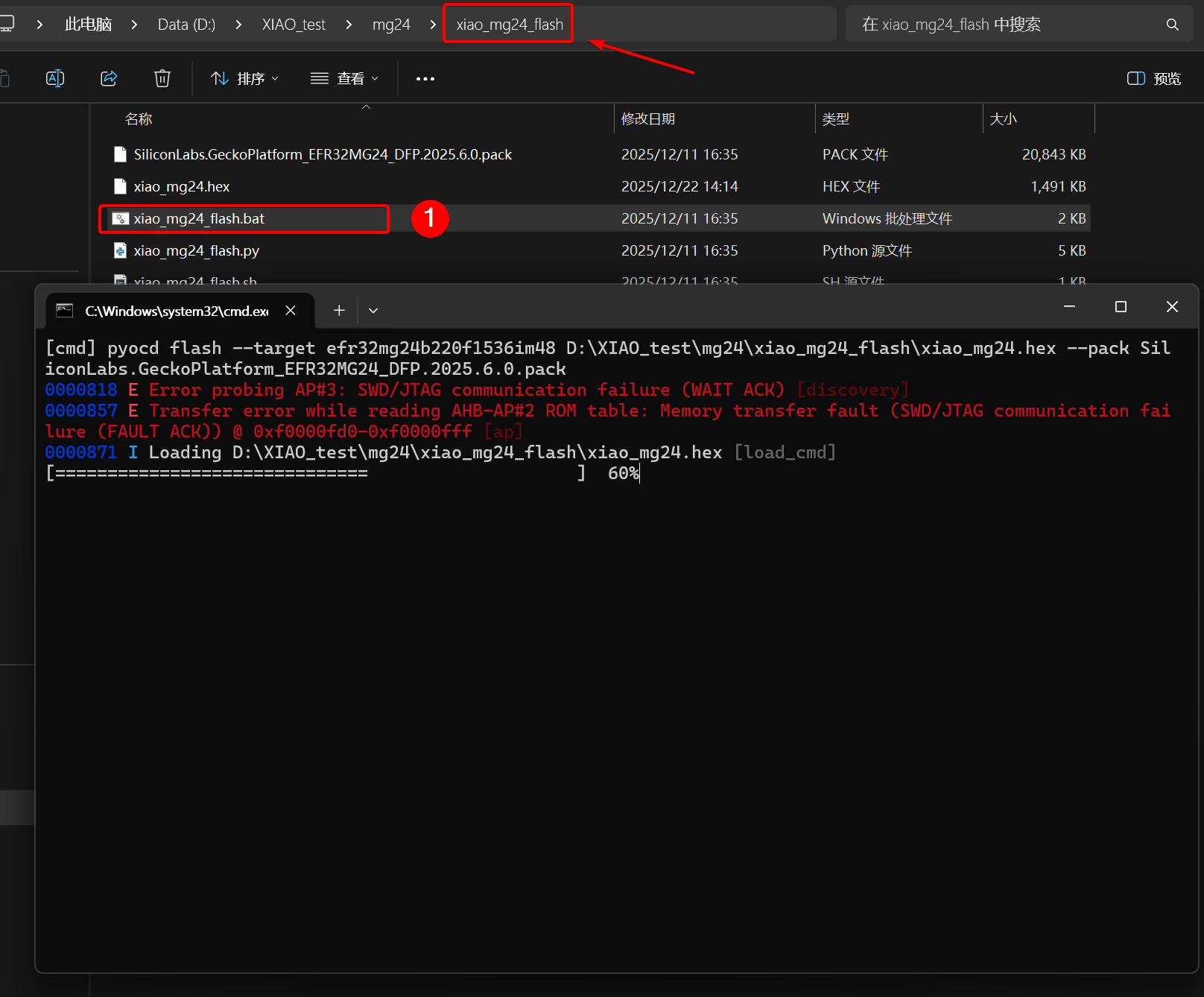 xiao_mg24_flash.bat. Release the RESET button when the script starts executing and wait for the programming to complete.