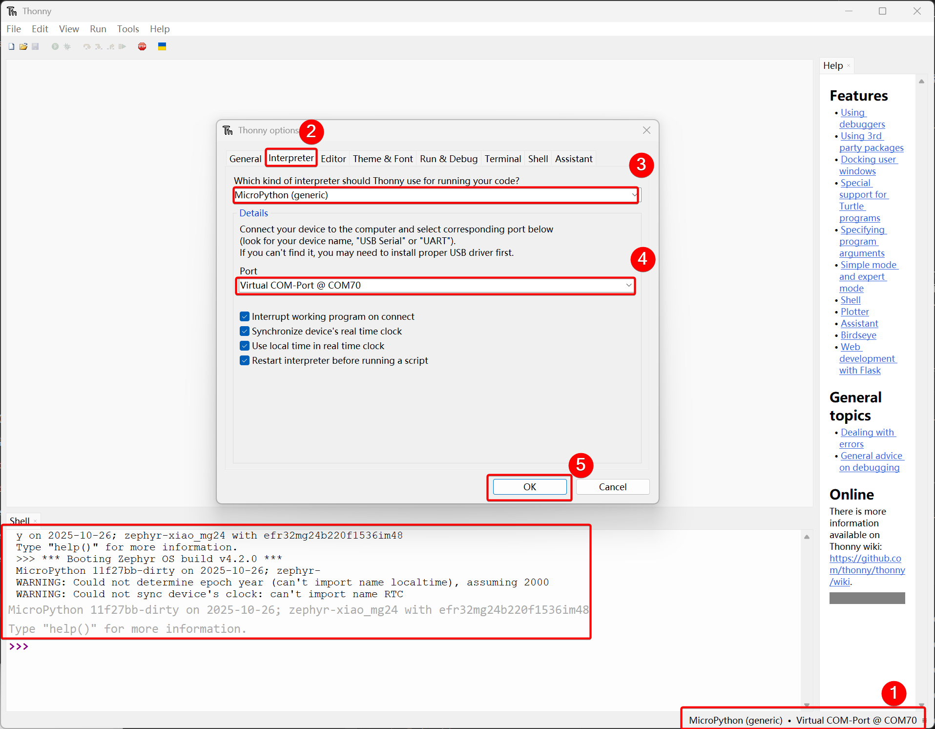 Open Thonny IDE, then click the bottom right corner of the interface to configure the interpreter options. Select MicroPython (generic) and Port. After successful configuration, the MicroPython version information will be displayed in the Shell.