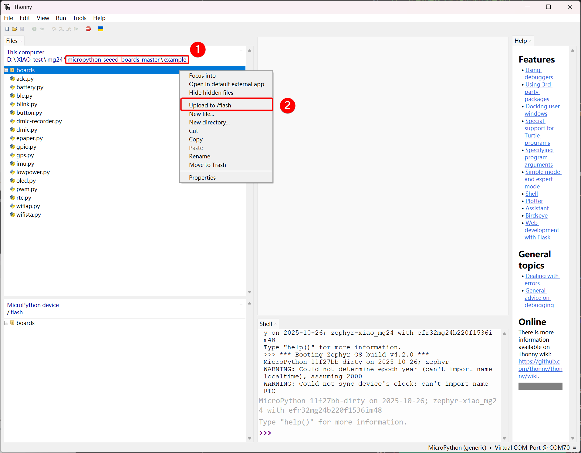 micropython-seeed-boards-master\examples - Select the boards folder and upload it to the flash. Then, you will be able to see the uploaded file on the MicroPython device/flash.