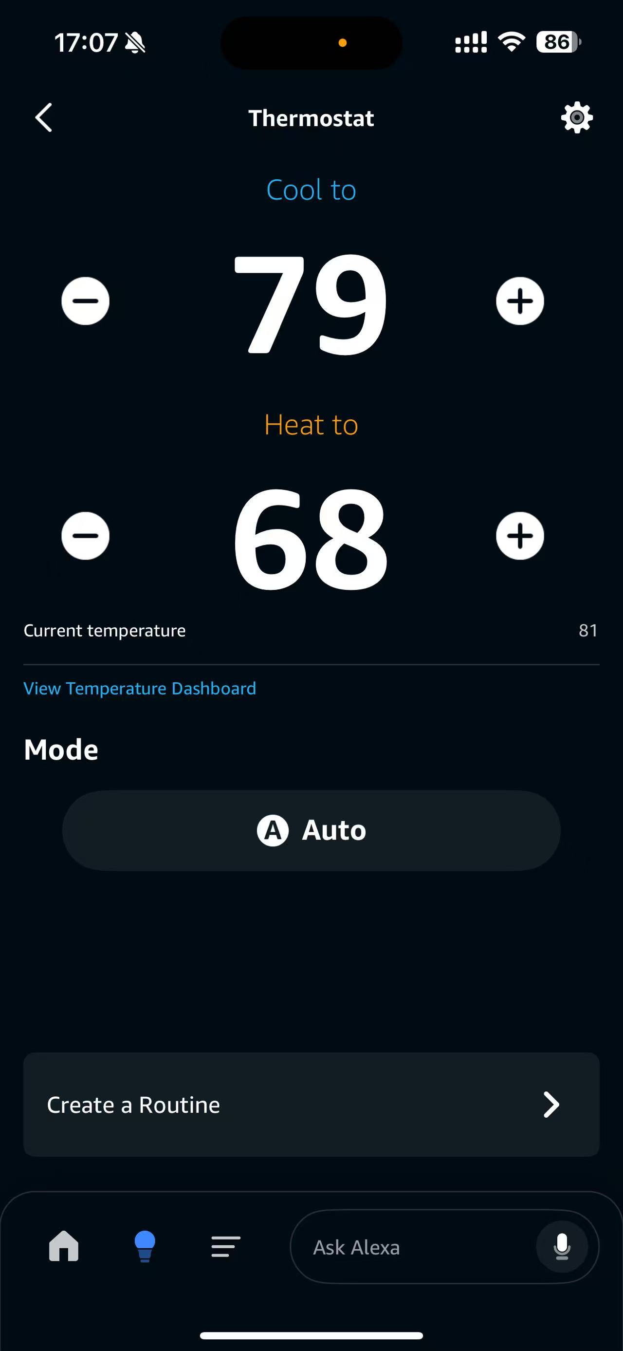 - Control Device:Open the Thermostat control page to adjust the temperature (e.g., Cool to 79°F, Heat to 68°F) and set the mode (e.g., Auto).