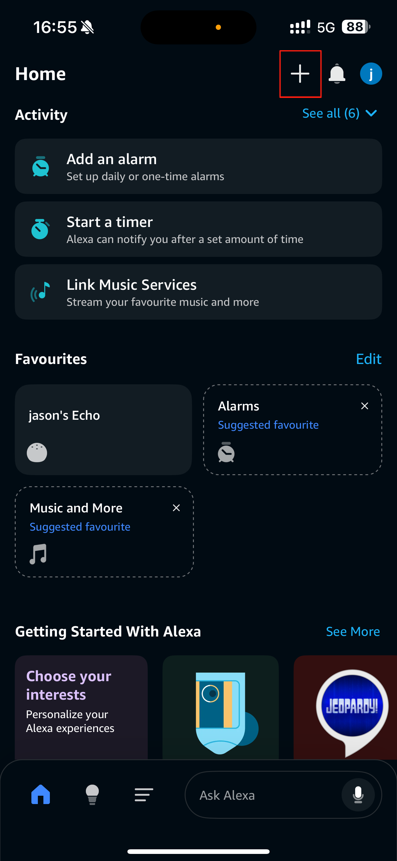 - Go to Home:Open the Alexa App and tap the “+” button in the top-right corner.