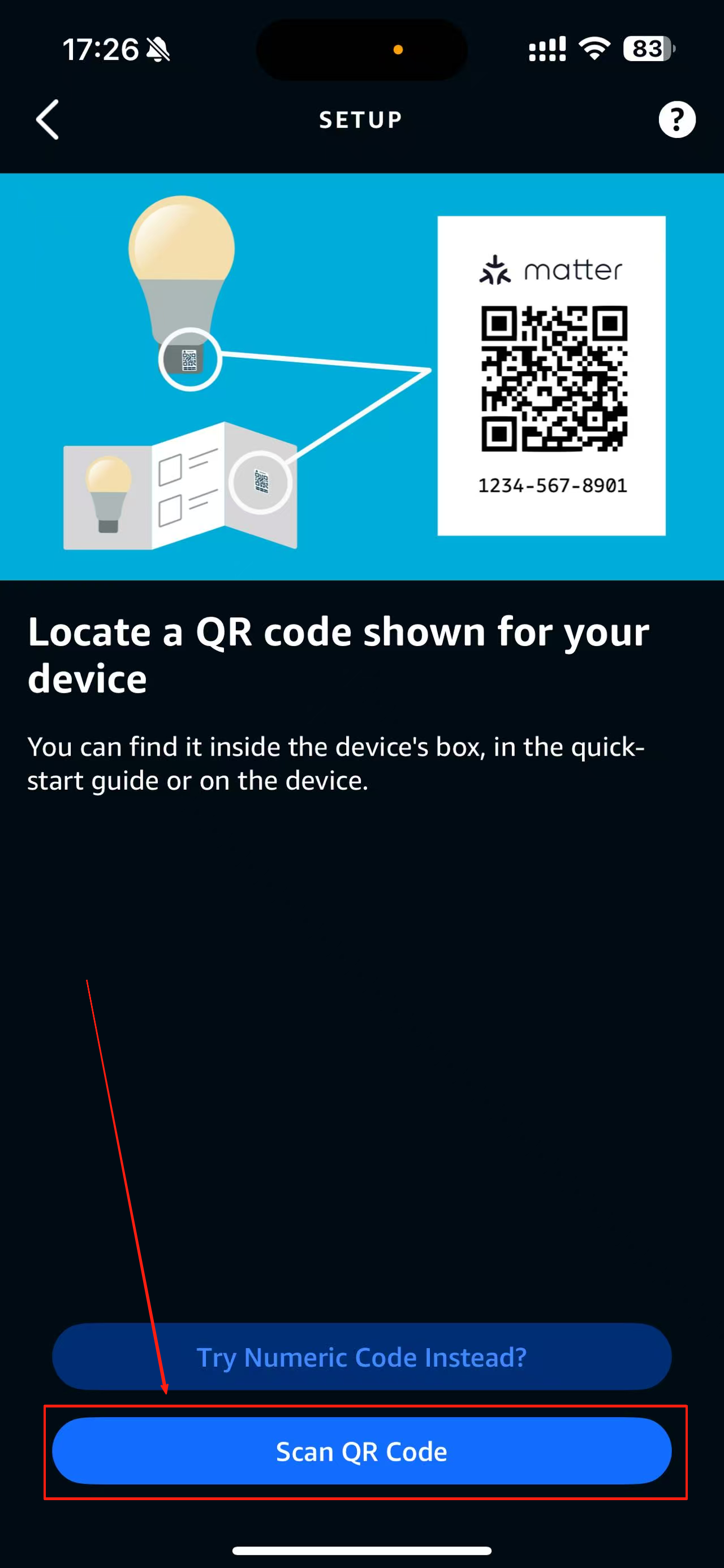 - Scan QR Code:On the Matter setup screen, tap “Scan QR Code” and scan the QR code on your device (or choose to enter the numeric code instead).